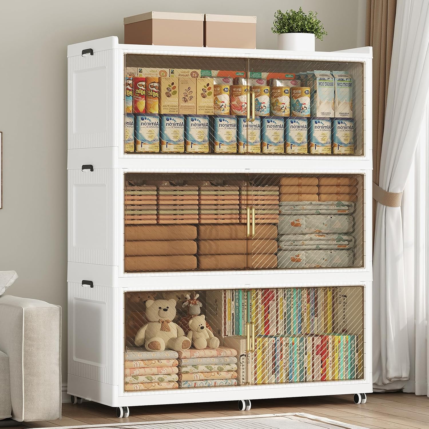 - 【Foldable, Stackable, Quick Assembly】Our large plastic storage bins can be quickly unfolded or collapsed in just 3 minutes to maximize space utilization. It can be stacked layer by layer into a cabinet, with side buckles to secure each level in place, preventing tipping or scattering. An essential large storage cabinet for homes and dorms.