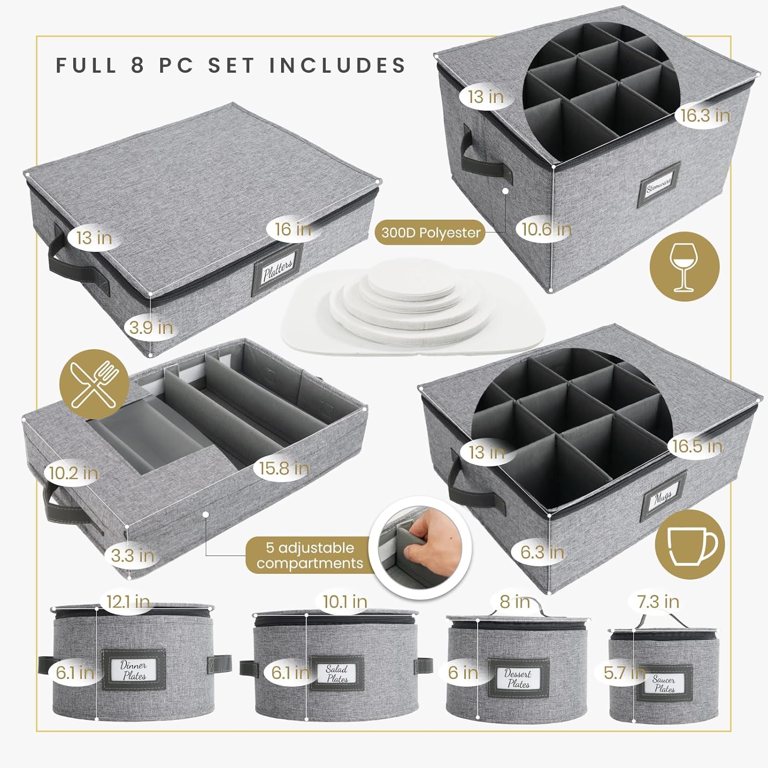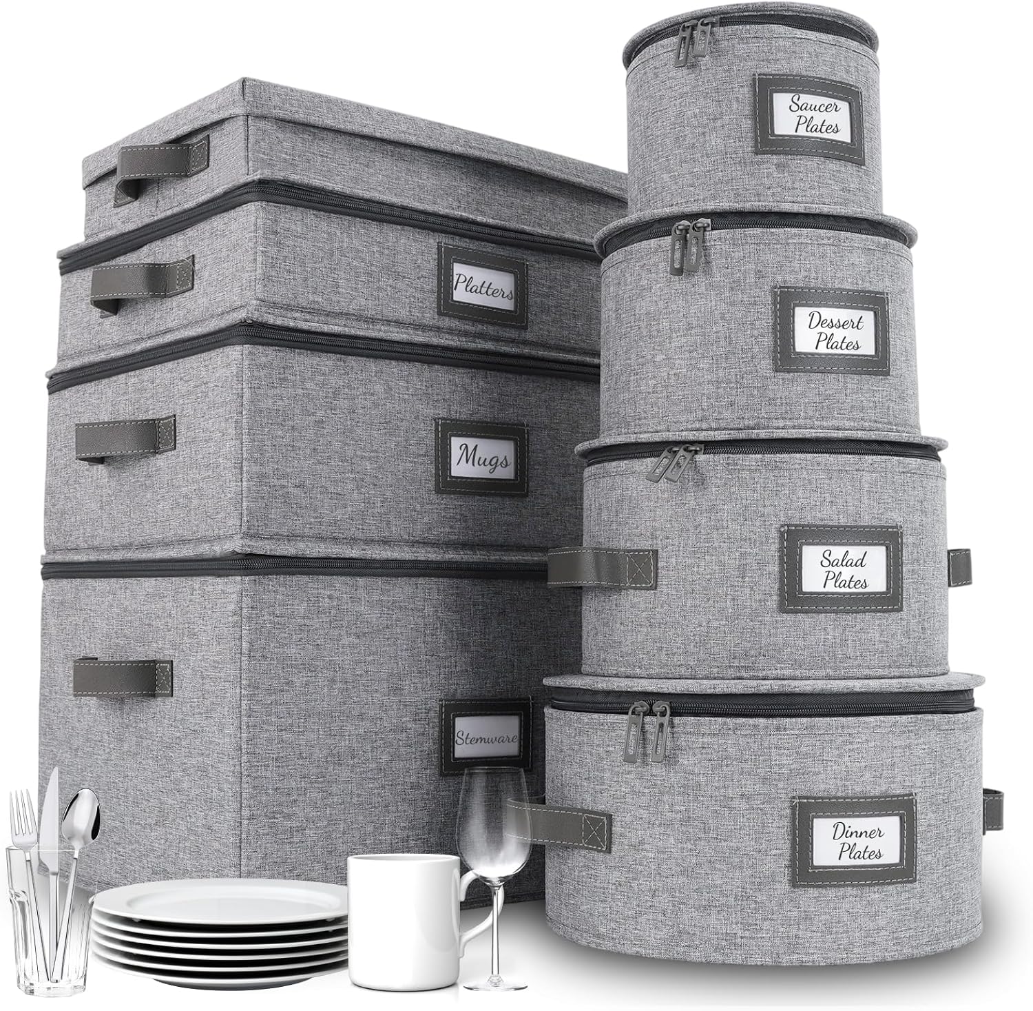 - 8-Piece Light Gray China Storage Box: Homelux Theory's china storage containers & storage bins with lids are a durable solution to ensure that your mugs, silverwares, platters, and dinnerwares stands the test of time. In this 8-peice set, you'll have 4 plate storage with 48 felt pads, 1 wine glass storage and coffee mug storage each with 12 compartments, flatware storage with 5 compartments, and a platter storage with 5 compartments. Each storage for china dinnerware sets have 2 sturdy handles.