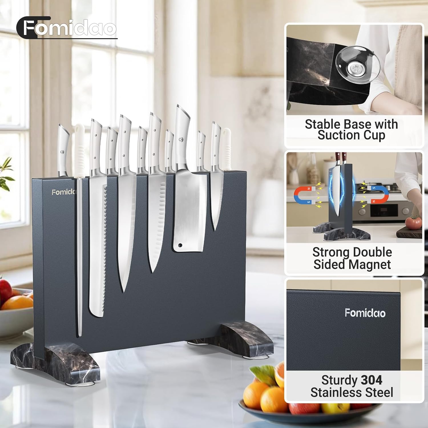 - Double-Sided Strong Magnetic Knife Holder: Fomidao magnetic knife block built-in three super strength hidden magnets,wide coverage and stainless steel which is same food-safe materials as your knives with strong adsorption to secure longest 8" knife blades.Powerful magnets for safe storage kitchen knives,also used in tool room,it is elegant and functional.