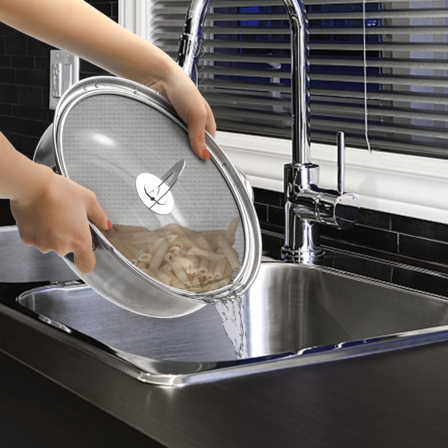 - 【EASY TO CLEAN AND VERSATILE】Cleaning the splatter screen after cooking is stress-free and it can be washed directly in the dishwasher without rusting. In addition to frying and simmering food, it can be used when you need to check the status of your food and worry about spills, It can also be used as a draining and straining tool