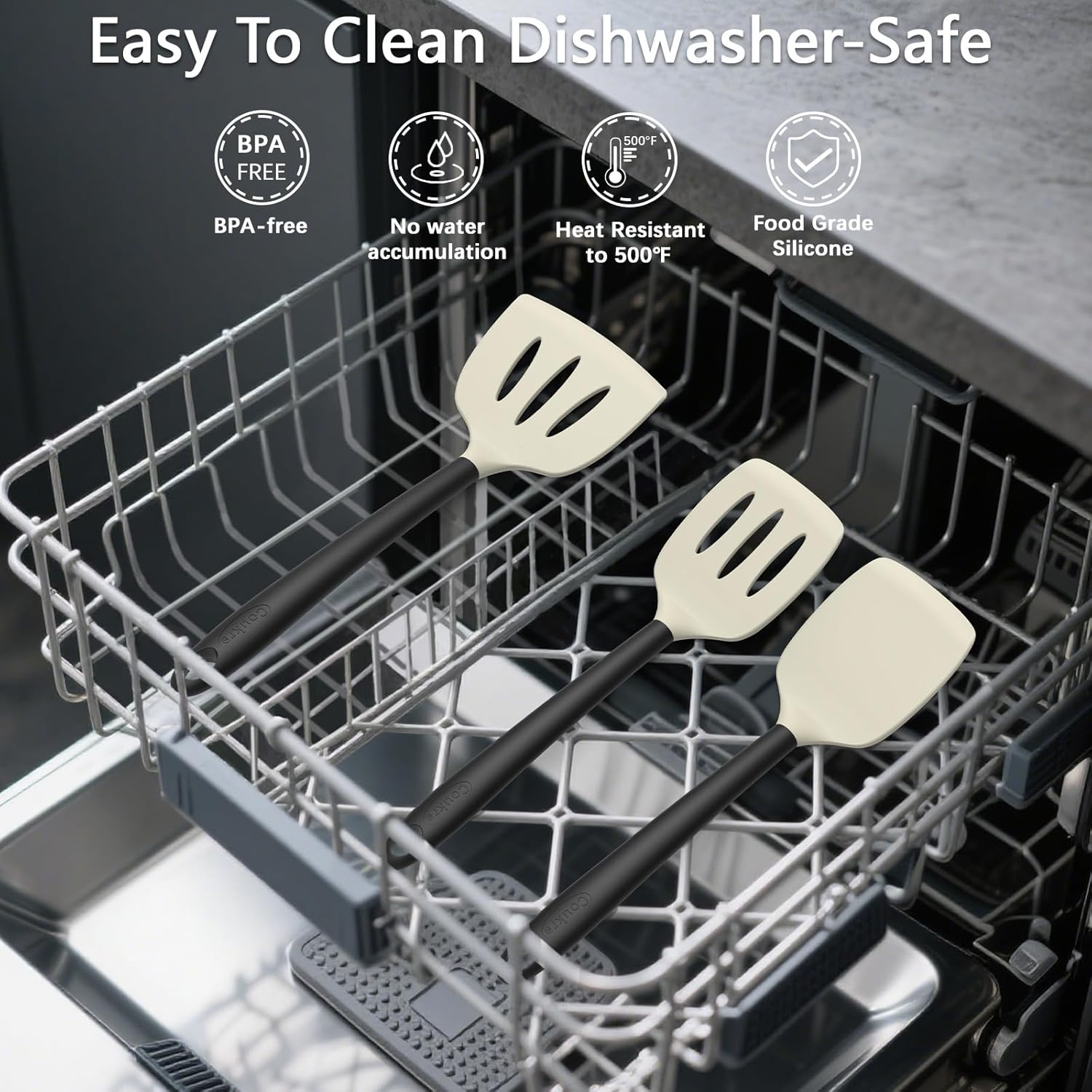 - [Easy to Clean & Dishwasher Safe]: The non-stick silicone surface makes cleanup a breeze, and all utensils are dishwasher-safe for added convenience. With top hanging holes and the included storage holder, organizing and storing your utensils is easier than ever