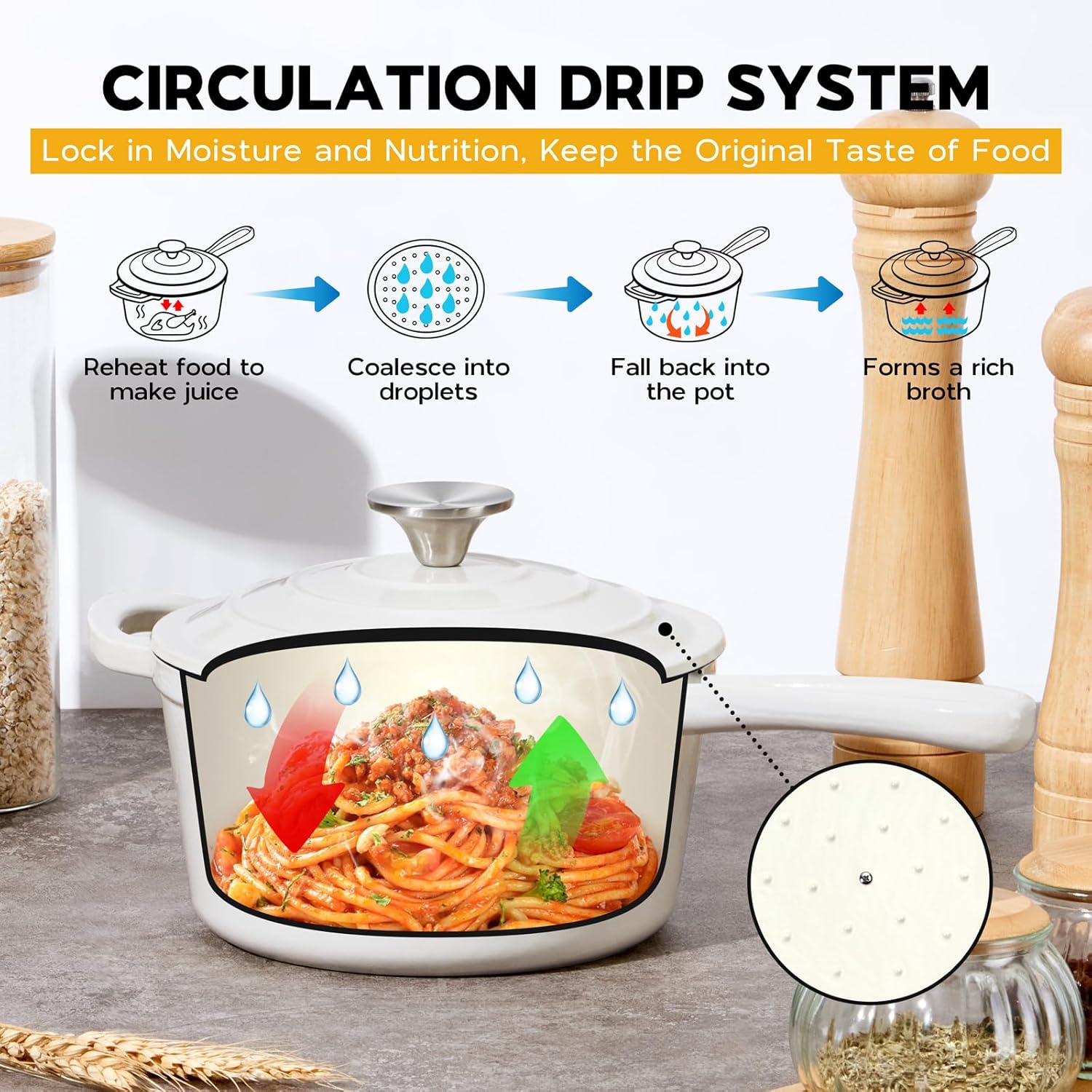 - Self Basting Lid: the raised dots underneath the lid collect condensed steam or broth and redirect it back onto the food, preserve the natural flavors and make food juicy, no seasoning required