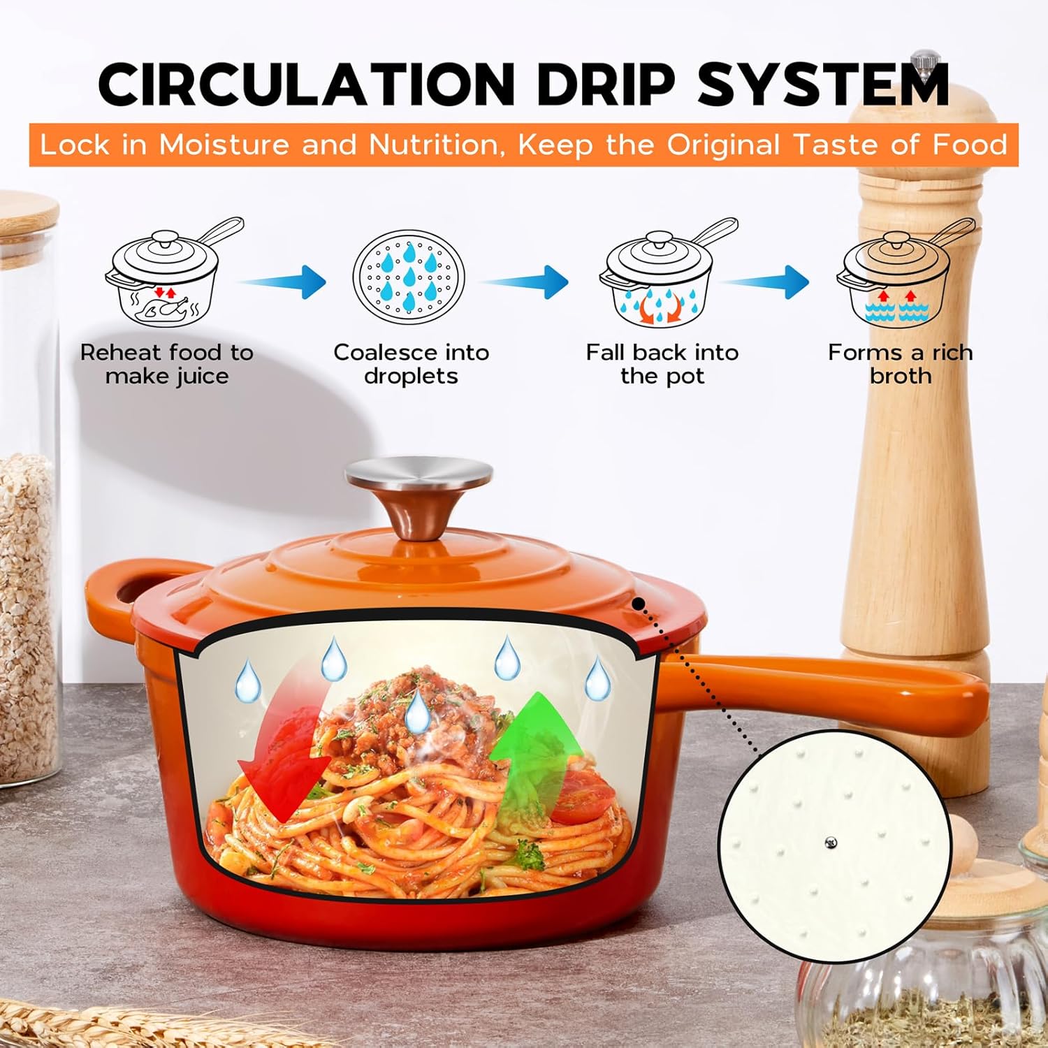 - Self Basting Lid: the raised dots underneath the lid collect condensed steam or broth and redirect it back onto the food, preserve the natural flavors and make food juicy, no seasoning required