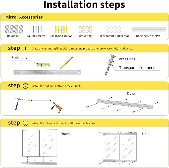 • Effortless Wall Mount Installation:Enjoy hassle-free setup with included J-bar brackets and step-by-step video guidance. Designed for flat walls including tile, brick, wood or painted surfaces, our secure mounting system keeps mirrors firmly in place with all necessary hardware pre-packed for quick installation without needing professional help.