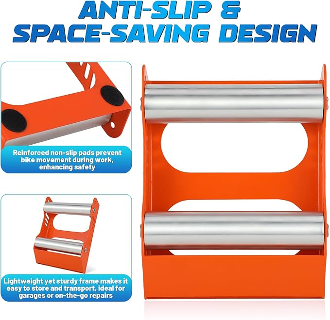 • 【Anti-Slip Space-Saving】 Featuring reinforced non-slip pads and a compact frame, this motorcycle bike stand prevents slippage during use. Its lightweight yet sturdy build makes it convenient for garages or on-the-go repairs.