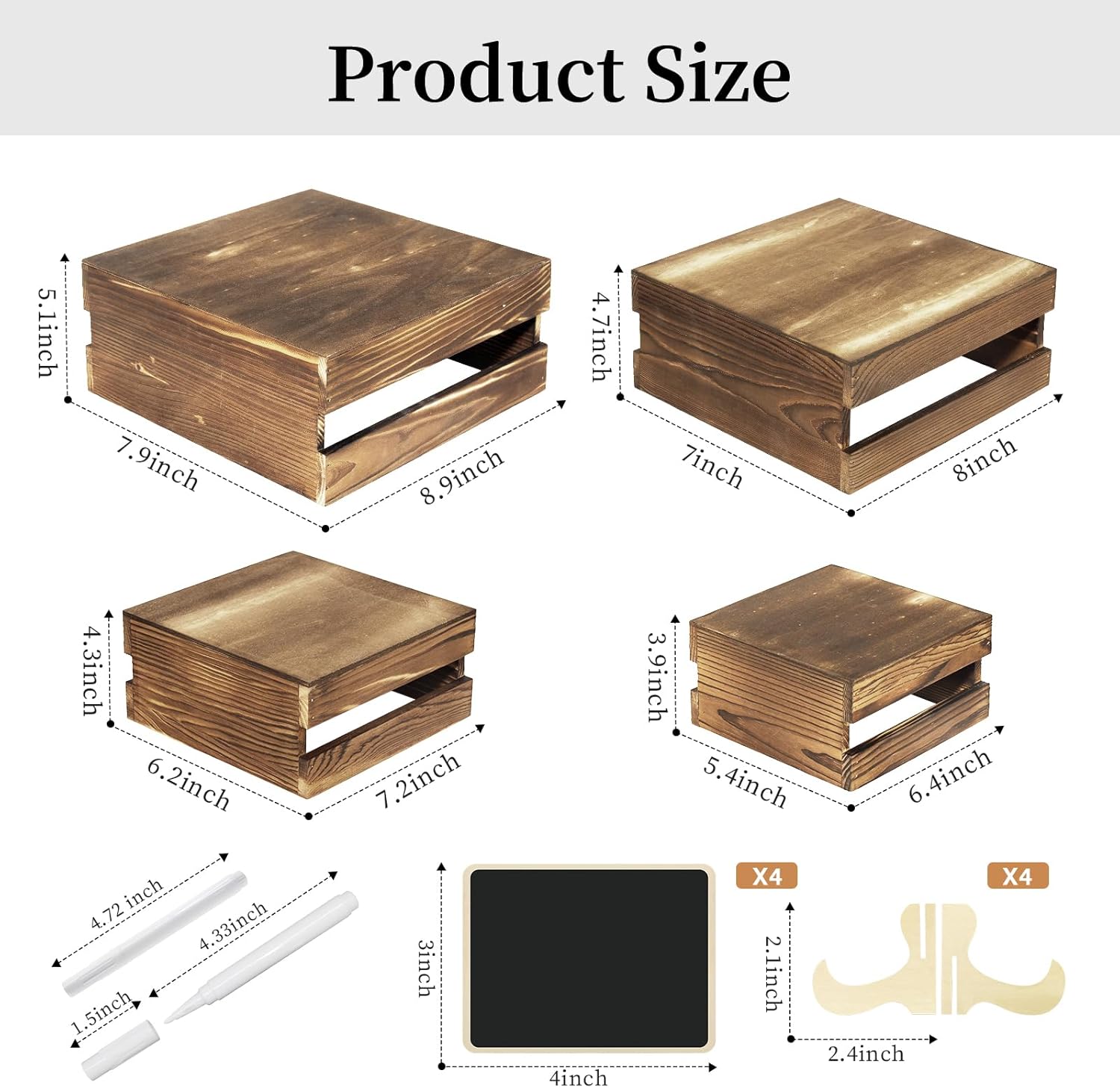 - Your Party's Sweet Companion: You will receive a set of 8 wooden cake stand risers (available in 4 sizes), 8 wooden signs and 2 pens, enough quantity and different sizes to meet the needs of different sizes of cakes, snacks and desserts for display. The wooden signs can be used to write down hints for ease of use while adding elegance to your dessert table.These wooden stackable display boxes will not take much displaying space