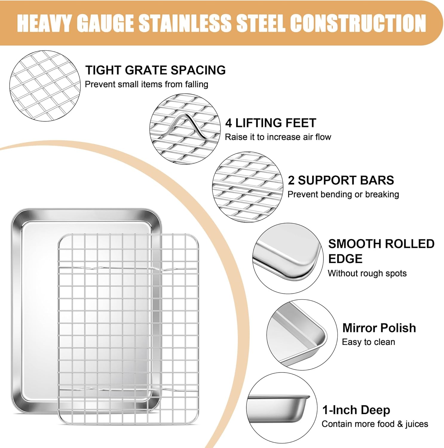 E-far Baking Sheet with Rack Set, 9.5” x 7.3” Stainless Steel Cookie Sheet Baking Pan for Toaster Oven, Mini Metal Tray with Cooling Wire Rack for Cooking Roasting, Non-toxic & Dishwasher Safe