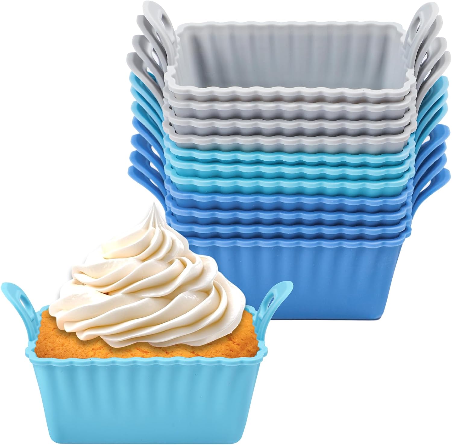 Koluti Nonstick Silicone Muffin Baking Cups Pack of 12, Reusable Cupcake Molds with Double Handle, BPA Free, Mini Rectangle Air Fryer Cupcakes Liner, 3 Colors