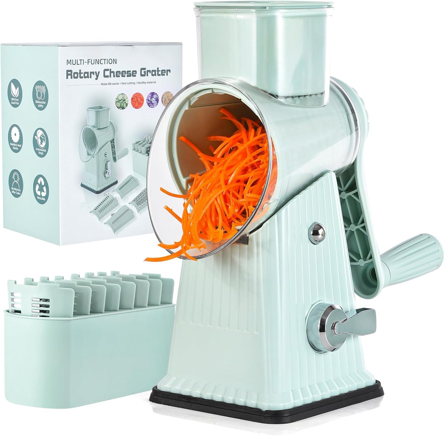 Rotary Cheese Grater, Vegetable Shredder 5 in 1 Cheese Grater with Handle edder Reinforced Suction,Easy to Clean,Kitchen Chopper for Crushed Ice,Fruits and Nuts with Blade Storage Case(Green)