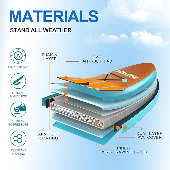• 【SLIP-RESISTANT DESIGN & SAFETY ROPES】- Crafted with heat-welded PVC and dual-layer drop-stitch technology, this SUP board ensures high pressure resistance without deformation. Non-slip deck enhances safety for all skill levels, minimizing injury risks during falls. It provides better grip in water sports and performs excellently in rivers, lakes or oceans. The upgraded cross safety rope helps keep the wrap in place during surfing or fishing.