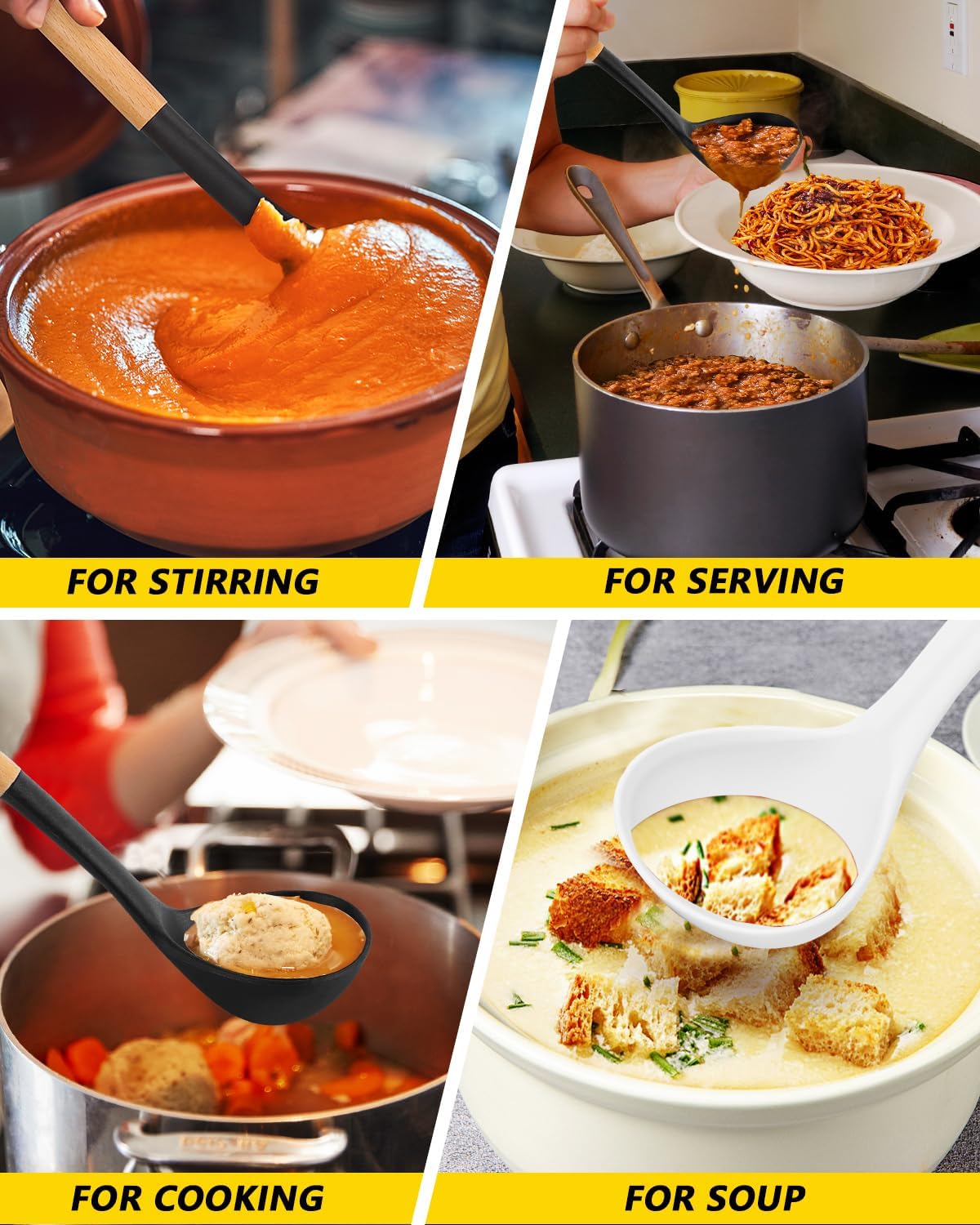 Pack of 2 Soup Ladle, Silicone Ladle Spoon with Wooden Handle, Large Non Stick High Heat Resistant Kitchen Utensils for Cooking, Stirring, Serving Soups(BLACK-WHITE)
