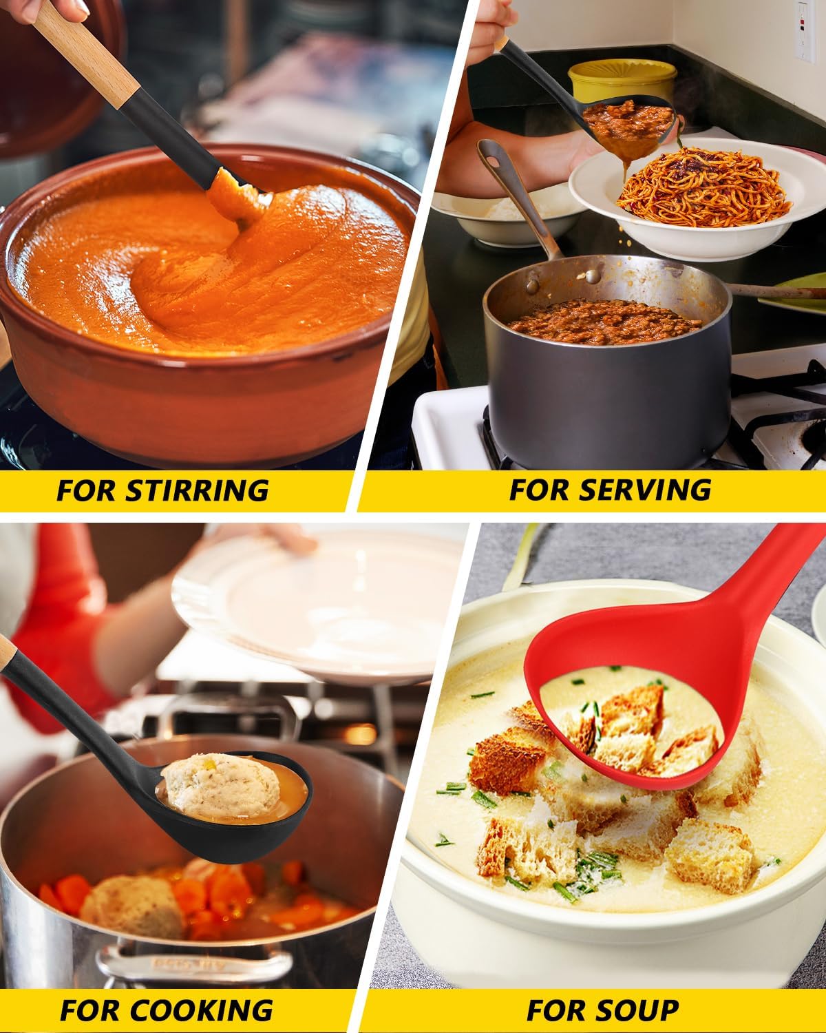 Pack of 2 Soup Ladle, Silicone Ladle Spoon with Wooden Handle, Large Non Stick High Heat Resistant Kitchen Utensils for Cooking, Stirring, Serving Soups(BLACK-RED)