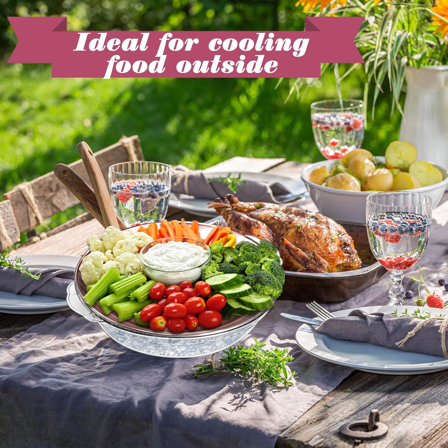 - Versatile Usage: this veggie trays for serving for party is suitable for family gatherings, company events, cookout, BBQ, picnic, camping; Elegant looking food cooler for any type of indoor or outdoor parties; Ideal for cooling food outside