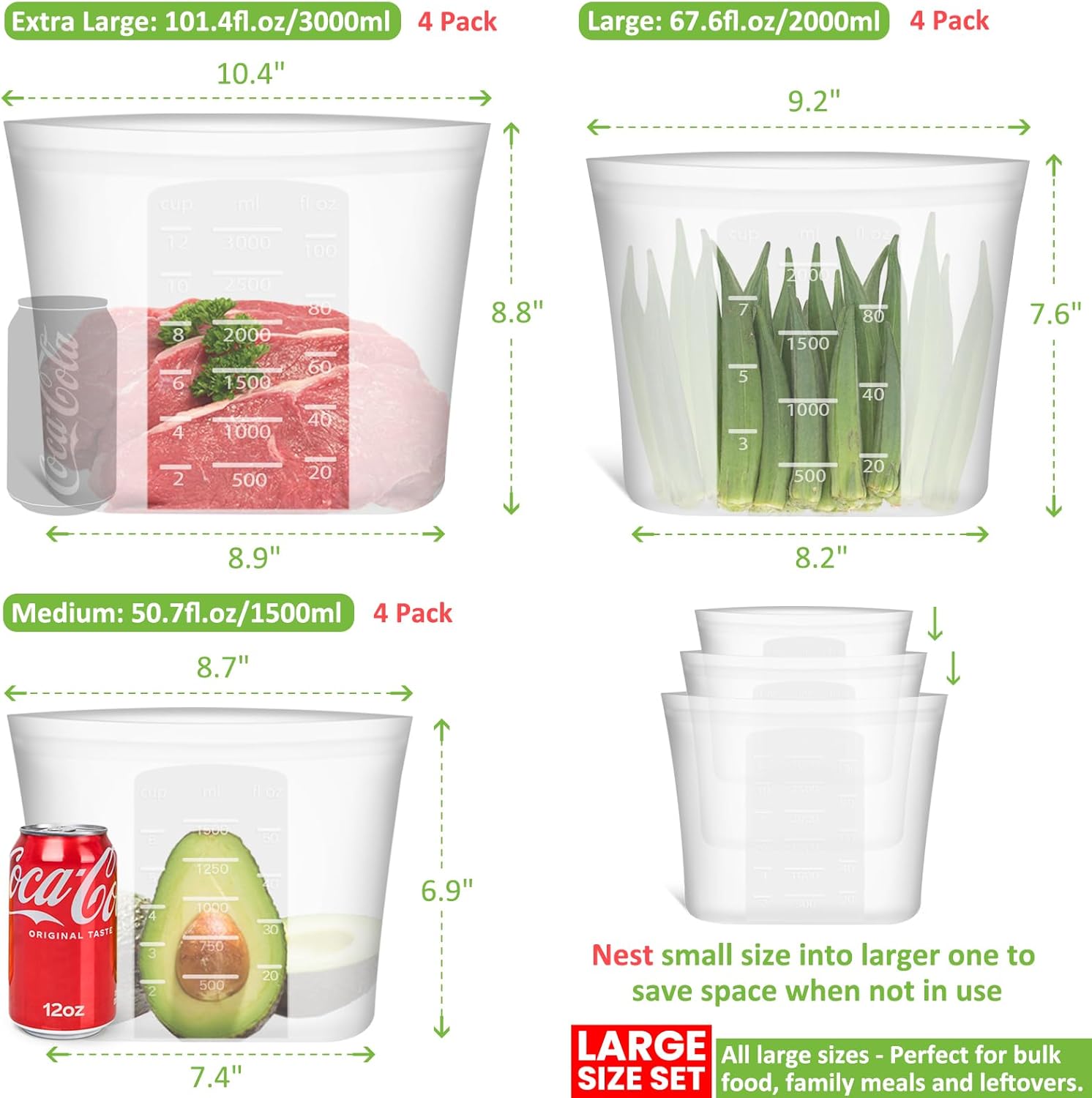 - 【LARGE-SIZE SET & ECONOMICAL】You’ll receive 4 Extra Large (0.8gallon/ 101fl.oz/ 3000ml), 4 Large (half gallon/ 67.6fl.oz/ 2000 ml) and 4 Medium (50.7fl.oz/ 1500ml) reusable bags. The ALL large-size set perfect for bulk food, family meals and leftovers. Each bag features volume markings(cup/fl.oz/ml) for easy measurement. The translucent design helps identify contents, and each bag can replace 300+ single-use plastic bags a year, promoting a waste-free world