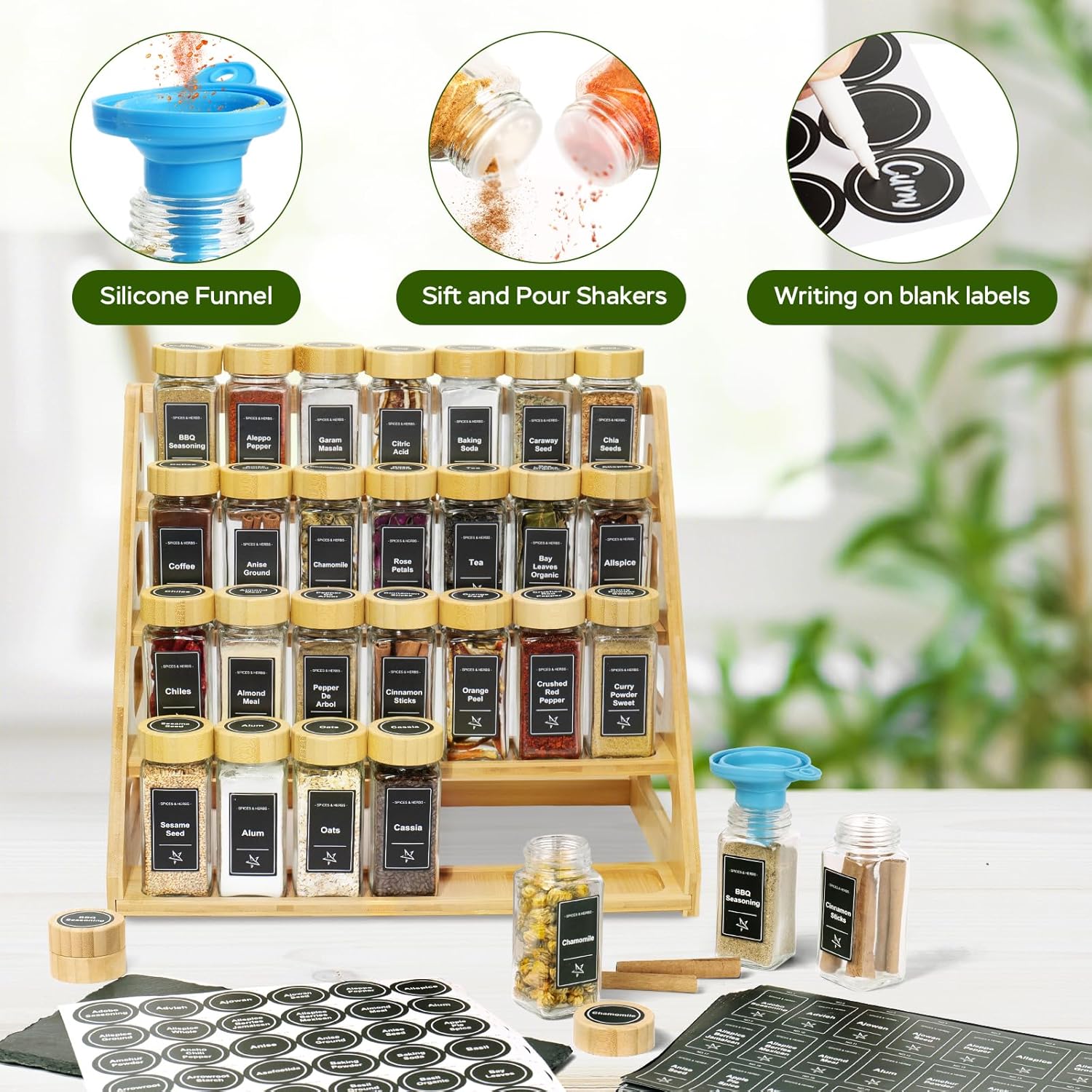 - 【A Complete Spice Organizer Tools Set】Hesitant about choosing a metal organizer or a bamboo organizer? After prolonged use, hollowed out metal shelves can become stained with grease and are difficult to wipe clean. Bamboo shelves are more beautiful, with a smooth surface that is easier to clean.1 x 4-tier Spice Rack, 28 x Square Empty Glass Spice Jars, 28 x Shaker Lids,1 x Collapsible Silicone Funnel, 1 x Chalk Marker, 780 Spice Labels(340 preprinted labels + 56 blank labels+340 preprinted labels+44 blank labels). The new updated spice rack organizer is designed specifically to turn any mess of spice into an organized masterpiece.