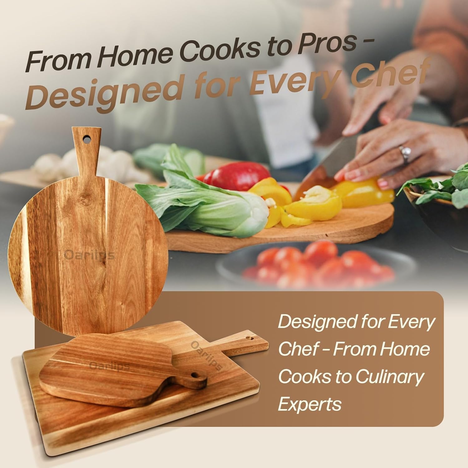 Acacia Wood Cutting Board Set of 3 with Handles – Round, Rectangular & Paddle Charcuterie Boards for Cheese, Meat, Pizza, Bread & Fruits