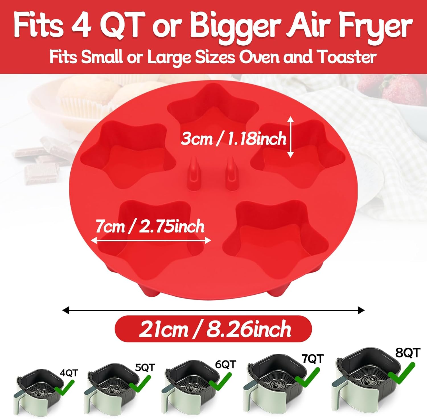 - Air Fryer Muffin Pan Cups Egg Bites Silicone Star Shape Mold:Our air fryer muffin pan is 8.26 x 8.26 inches and each cup is 2.75 inch in diameter,cup depth: 1.18 inch,This size design makes the suitable for smallest air fryer 4QT perfectly match,fits 4 QT or bigger air fryer.These egg bite maker are engineered for convenience and are compatible with a wide range of air fryers and ovens,the 5 cup design per pan of silicone egg bite molds ensures consistent, evenly baked results every time