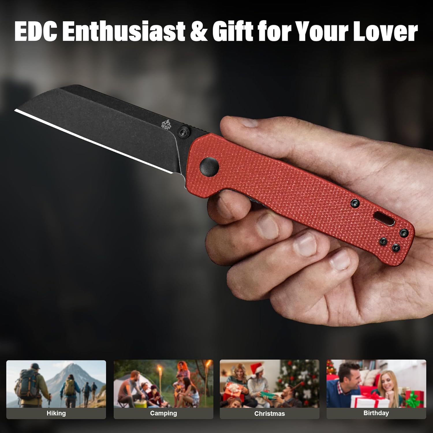 QSP Penguin V2 Folding Pocket Knife, 3.06" D2 Black Stonewash Blade EDC Knife, Red Micarta Handle, Liner Lock, Ceramic Ball Bearings, Reversible SS Deep Carry Clip