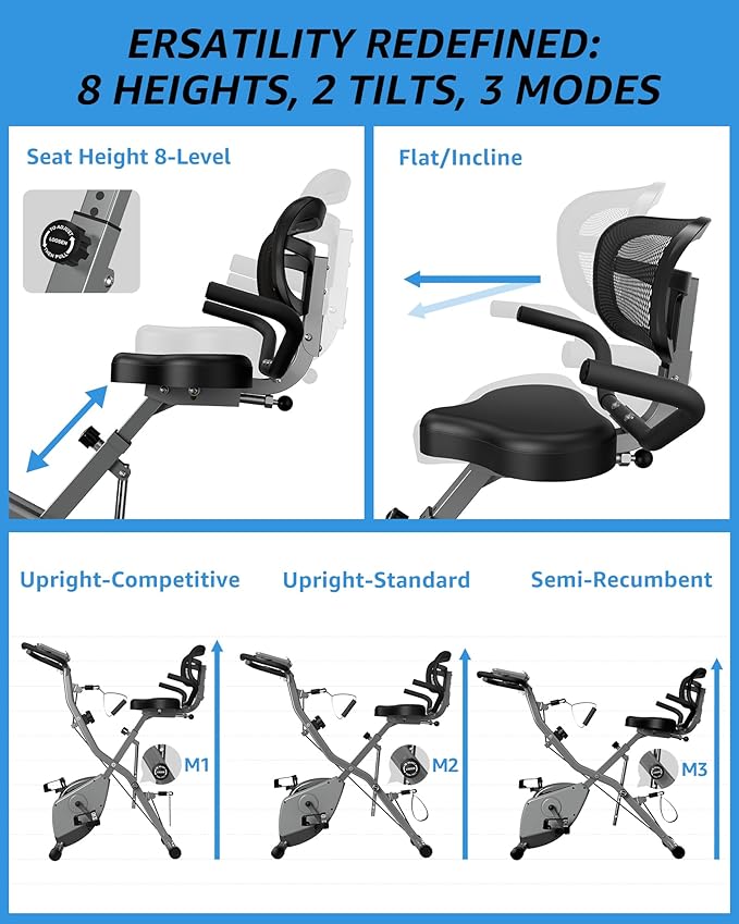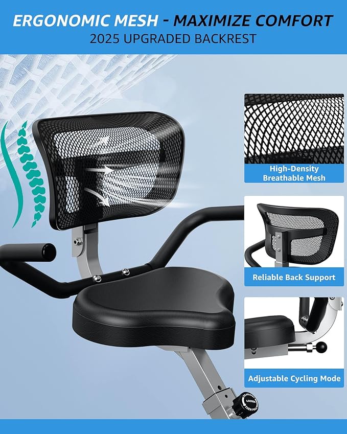 • 5-IN-1 MULTI-FUNCTIONAL EXERCISE BIKE WITH BREATHABLE SUPPORT: Transition effortlessly between three modes. Our upgraded ventilated mesh backrest elevates every position with airflow-rich comfort, offering full-back support that keeps you cool during intense sessions while maintaining spinal alignment. Beyond versatile cycling modes, dual hand pull cords sculpt upper body strength and leg pull cords power up lower muscle groups.The anti-slip ergonomic design ensures stability for workouts.