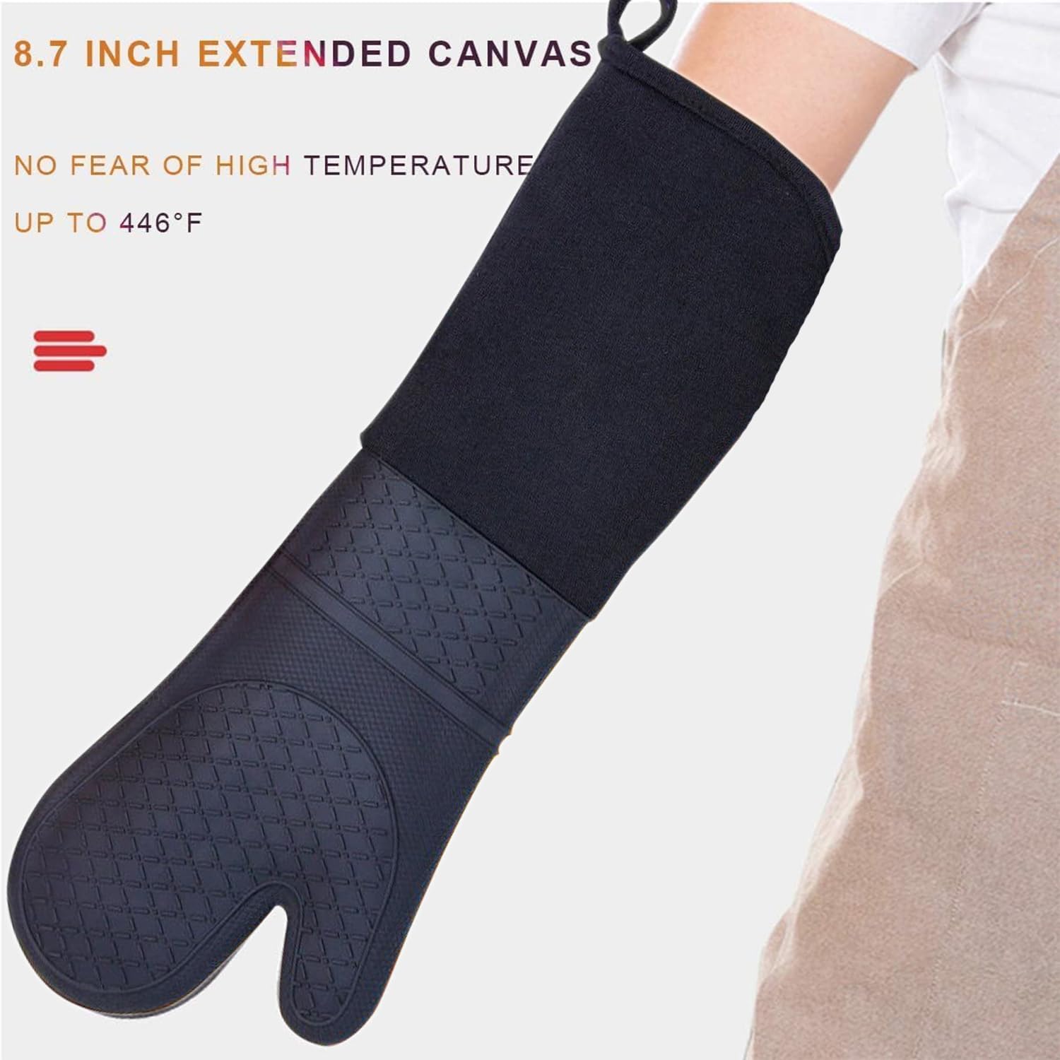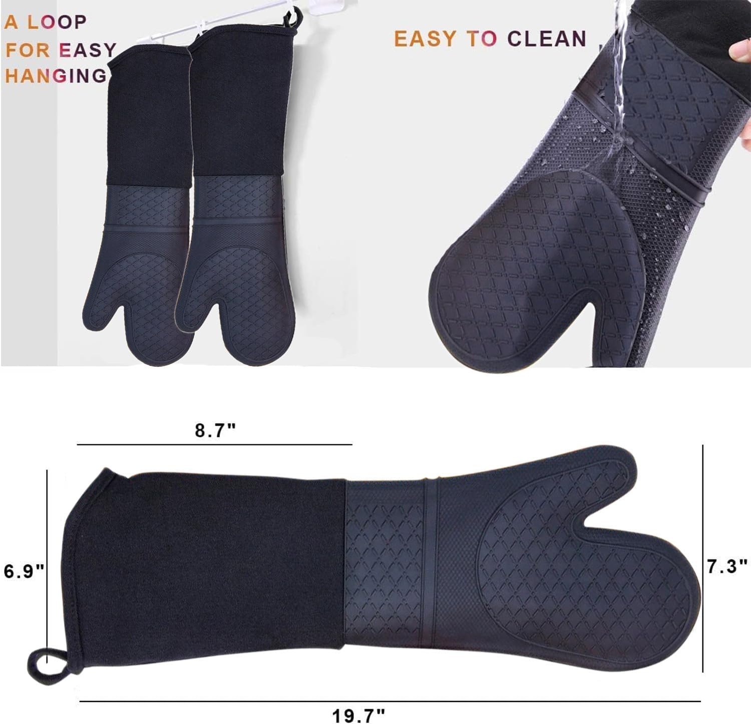 Extra Long Silicone Oven Mitts Heavy Duty Commercial Grade Oven Mitts Heat Resistant BBQ Gloves with Quilted Cotton Lining 2 Pack (Black)