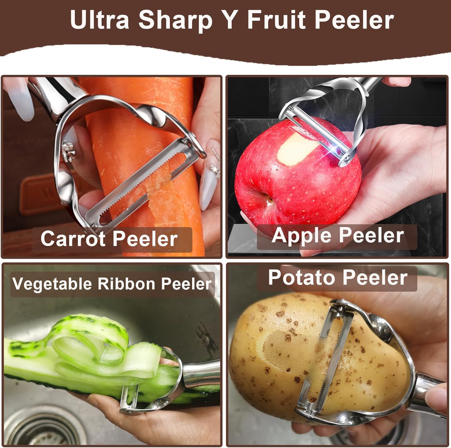 - MULTIPURPOSE Y-VEGGIE PEELER - The superior food Y-shaped peeler design offers greater control and leverage than traditional straight peelers, allowing you to work quickly and efficiently through large batches of vegetables for holiday meals, canning, or daily cooking tasks. The potato peeler can be placed in the dishwasher for cleaning or rinsed in water. The storage ring at the bottom of vegetable ribbon peeler allows you to easily store it in the kitchen, making the kitchen clean and tidy.
