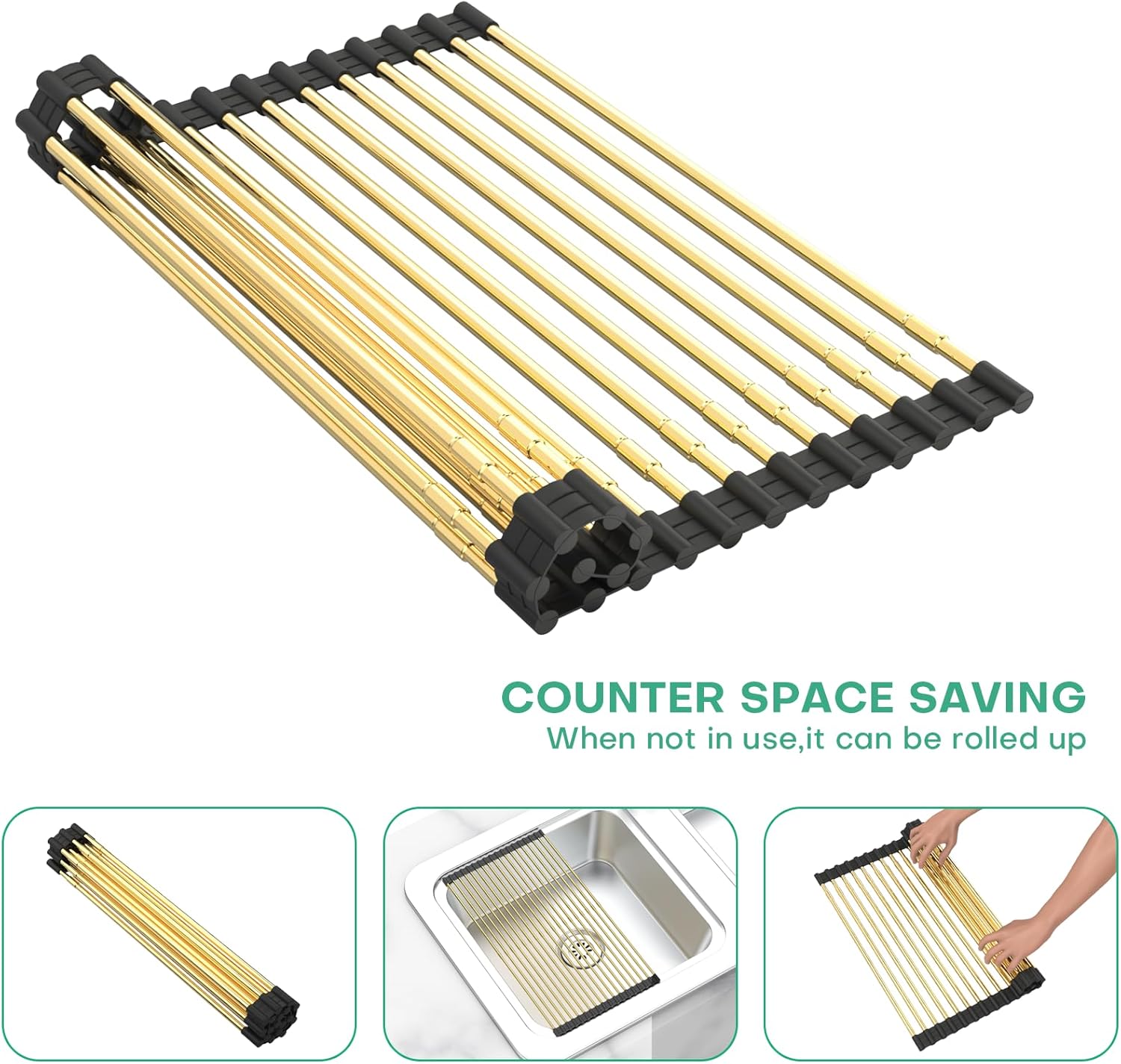 Expandable Large Draining Rack, Roll Up Heat-Resistant Dish Drainer for Stainless Steel Sinks, Collapsible Over The Sink Rack Non-Slip Silicone Rolling Up Rack Gold 18 Tube