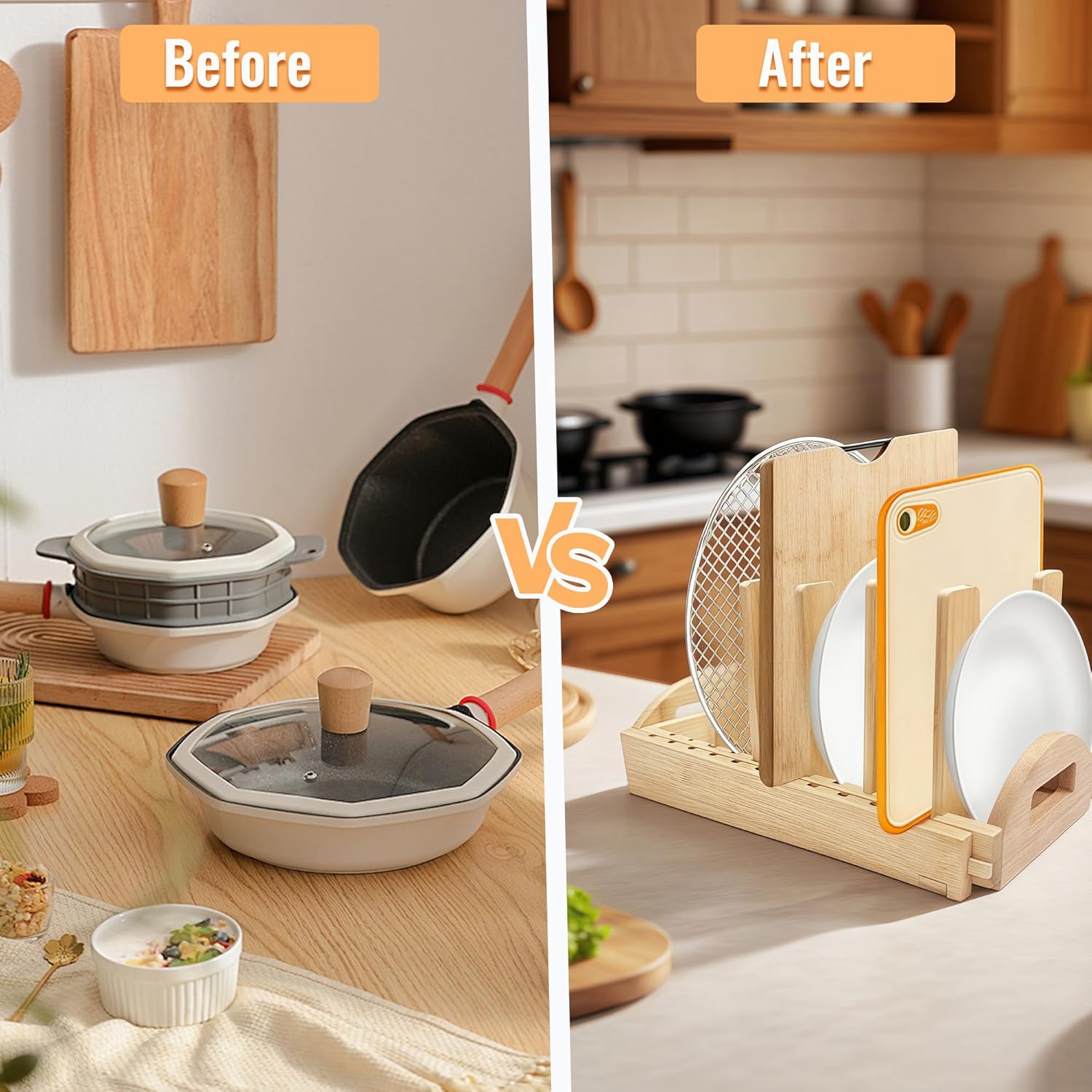 - 【Durable and Beautiful】Made of 100% high quality solid bamboo, sturdy structure and natural appearance, perfect for storing a variety of cooking utensils such as frying pans, skillets, plates, etc., which is not only practical, but also enhances the aesthetics of the kitchen, which is ideal for both home and business people.