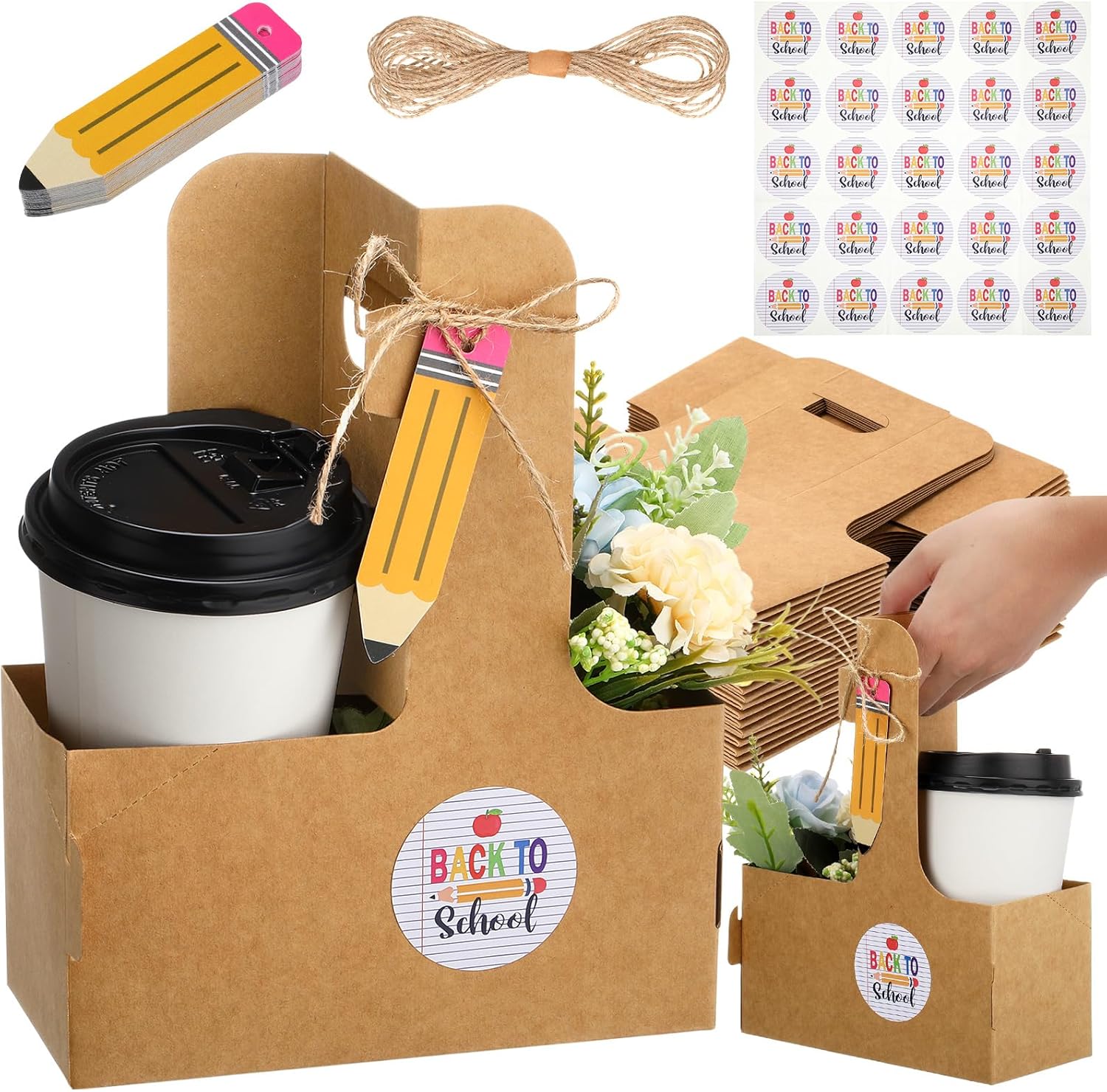 - Sufficient Quantity: this 2 cup carriers for drinks set package contains a total of 25 brown cardboard two cup drink holders, and also comes with 25 pencil gift tags and one roll of hemp rope, 25 pcs Back to school Stickers; Our Back to School Drink Carrier with Handle set are suitable for back to school parties, first day of school party, teacher's day, other festivals or use daily