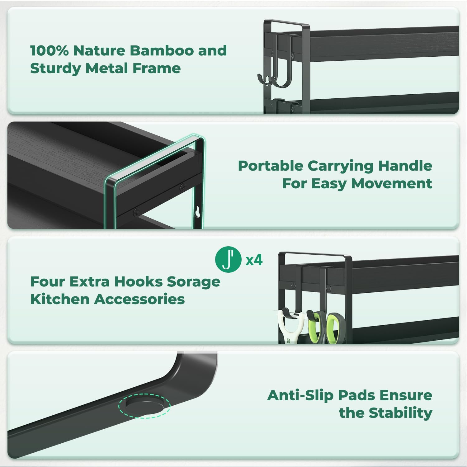 EsLuker.ly Spice Seasoning Rack Organizer Kitchen Countertop, 4 Tier Bamboo Spice Shelf Holder Storage with 4 Hooks, Wall Mounted Freestanding Stand for Pantry, Black (Jars Not Included)