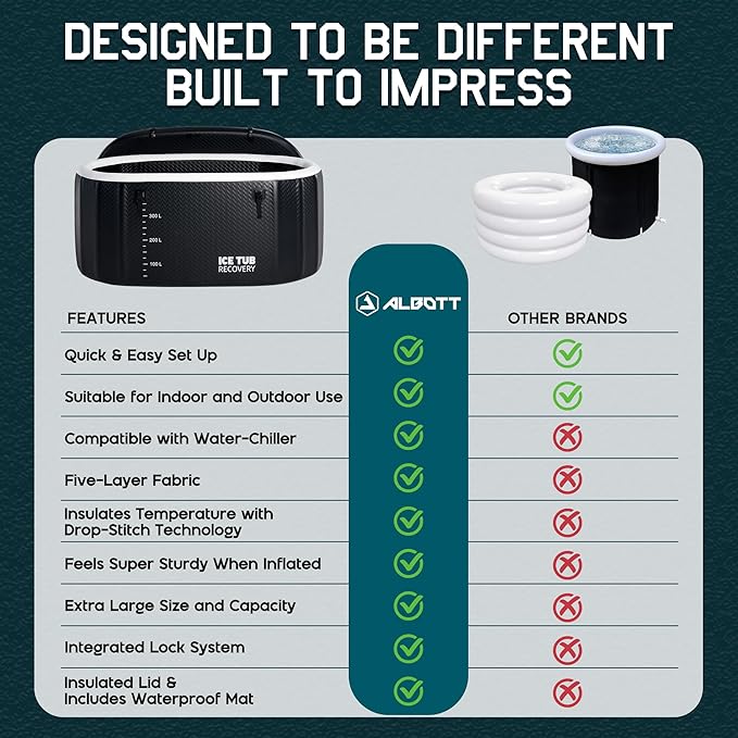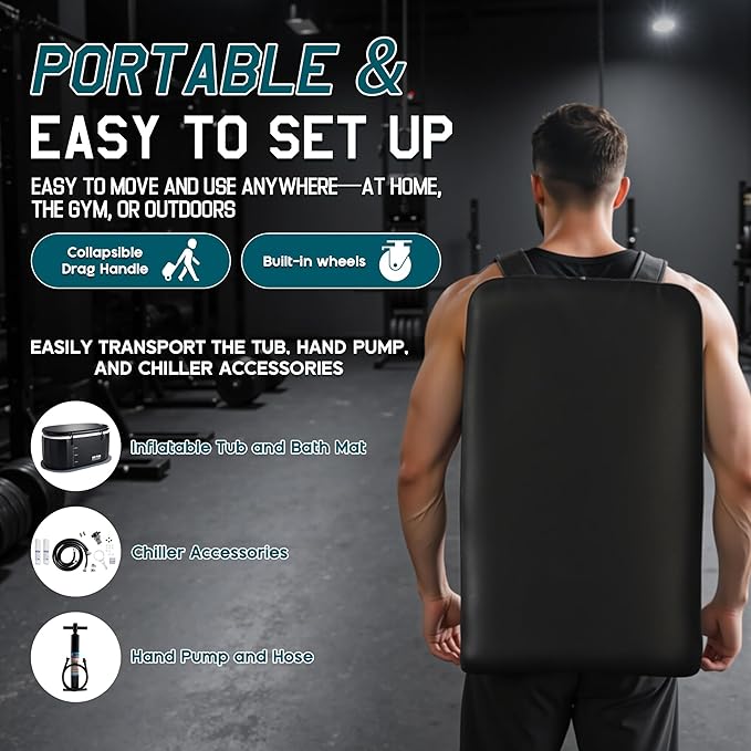 • Portable, Quick to Setup, Built to Move: Our ice bath tub with water chiller Inflates in minutes with included pump. Built-in wheels and foldable handle make storage and transport a breeze—from patio to training camp