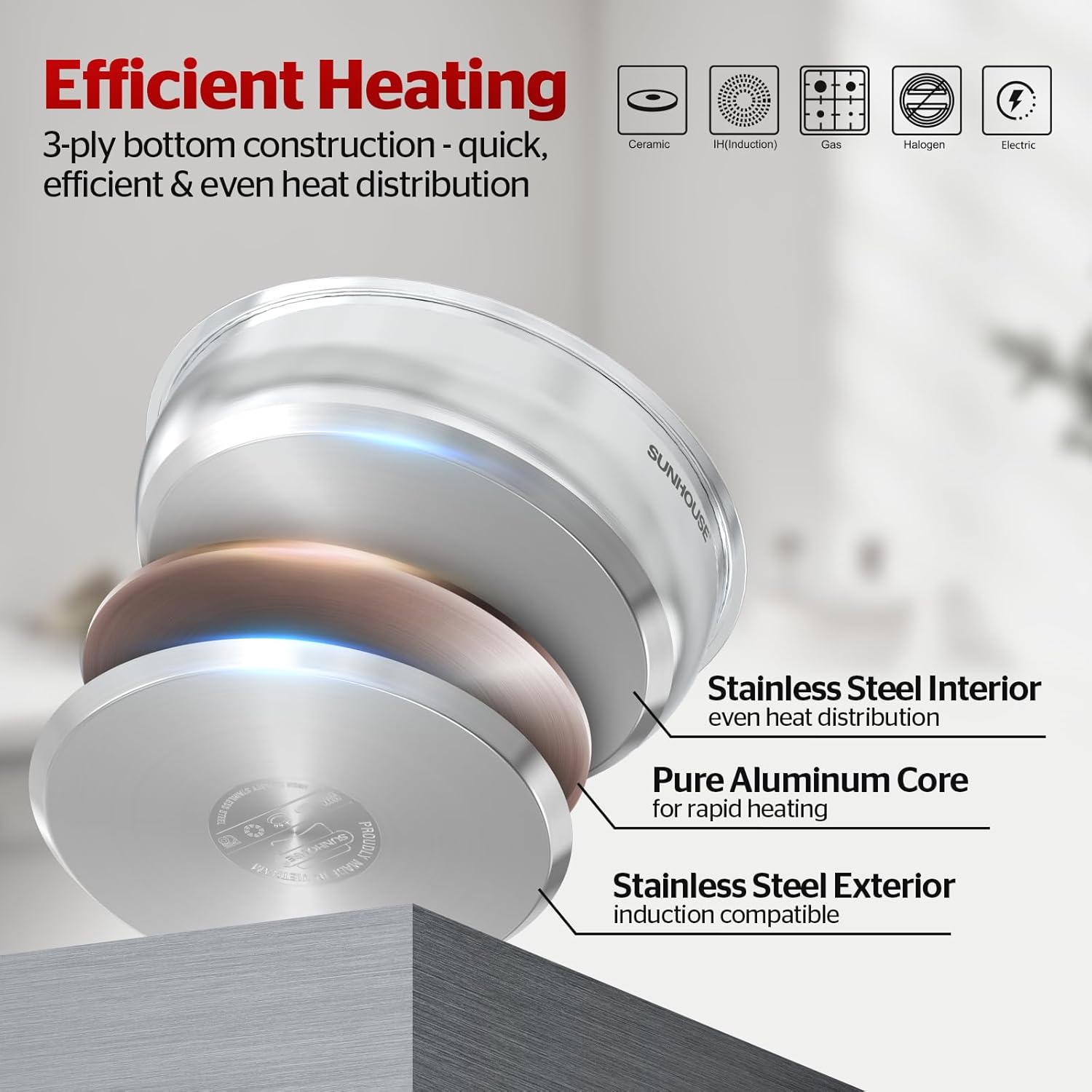- Healthy Cooking Made Easy - Sunhouse's 5.5 QT Steamer & 3.8 QT Stockpot which made of premium material is non-toxic and food-grade for better health, nutrition, and cooking. The high-quality stainless-steel cooking surface won't react with food or alter natural flavours for consistent cooking results