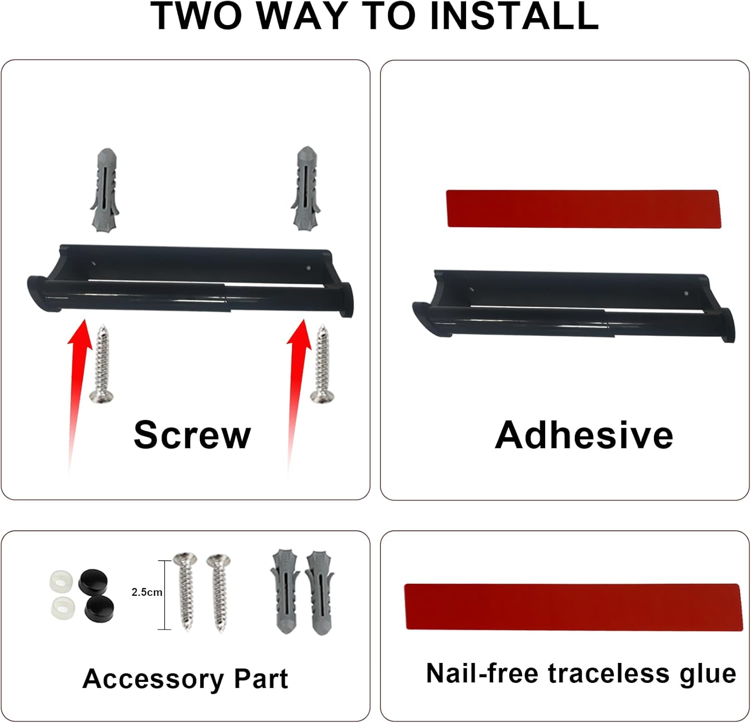- 【Kitchen tissue holder wall with two mounting options】① Adhesive: For glass surfaces, tiles, or painted furniture – the high-performance adhesive pad* holds securely (*up to 8 kg). ② Screws: For permanent stability on plasterboard walls or wooden panels