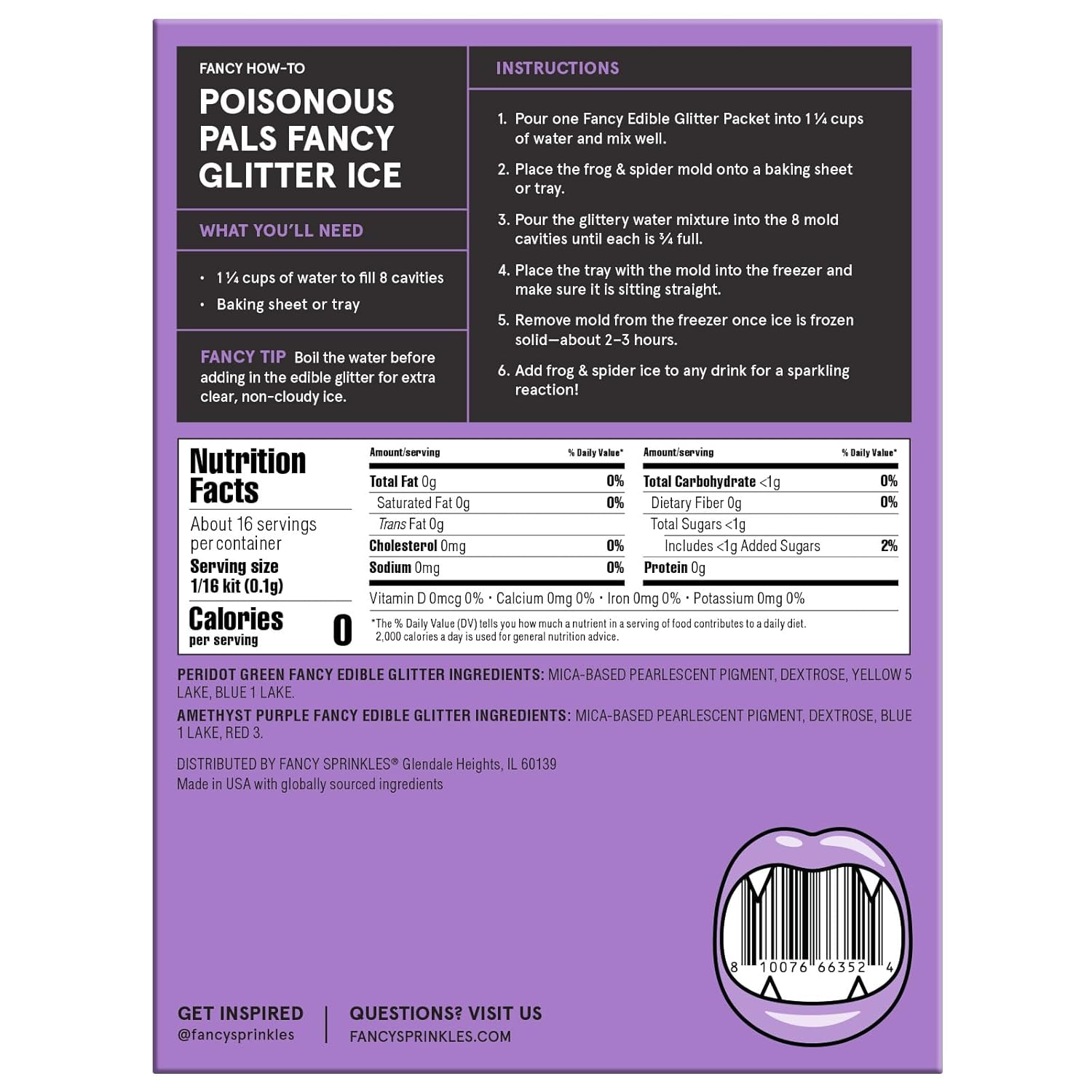 - EASY TO USE: Place the frog & spider mold onto a baking sheet or tray; Mix one Fancy Edible Glitter Packet into water; Pour the glittery water mixture into the mold: Place the tray with the mold into the freezer, and you'll have creepy ice in 2-3 hours!