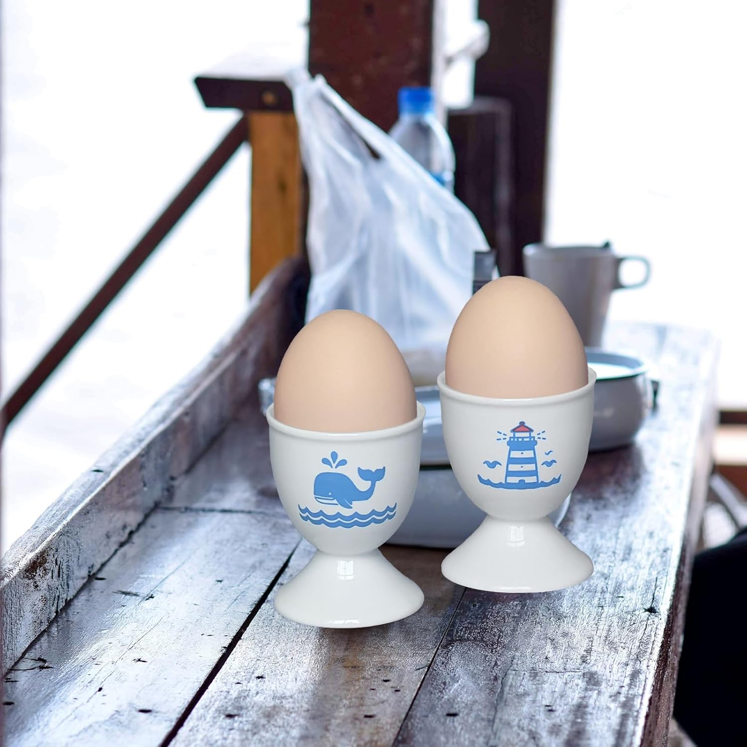- Vintage-Inspired Design: This ceramic egg cup set features two stunning designs—one with a lighthouse symbolizing safety and guidance, and the other with a whale representing tranquility and peace, adding a nostalgic, vintage touch to your kitchen.
