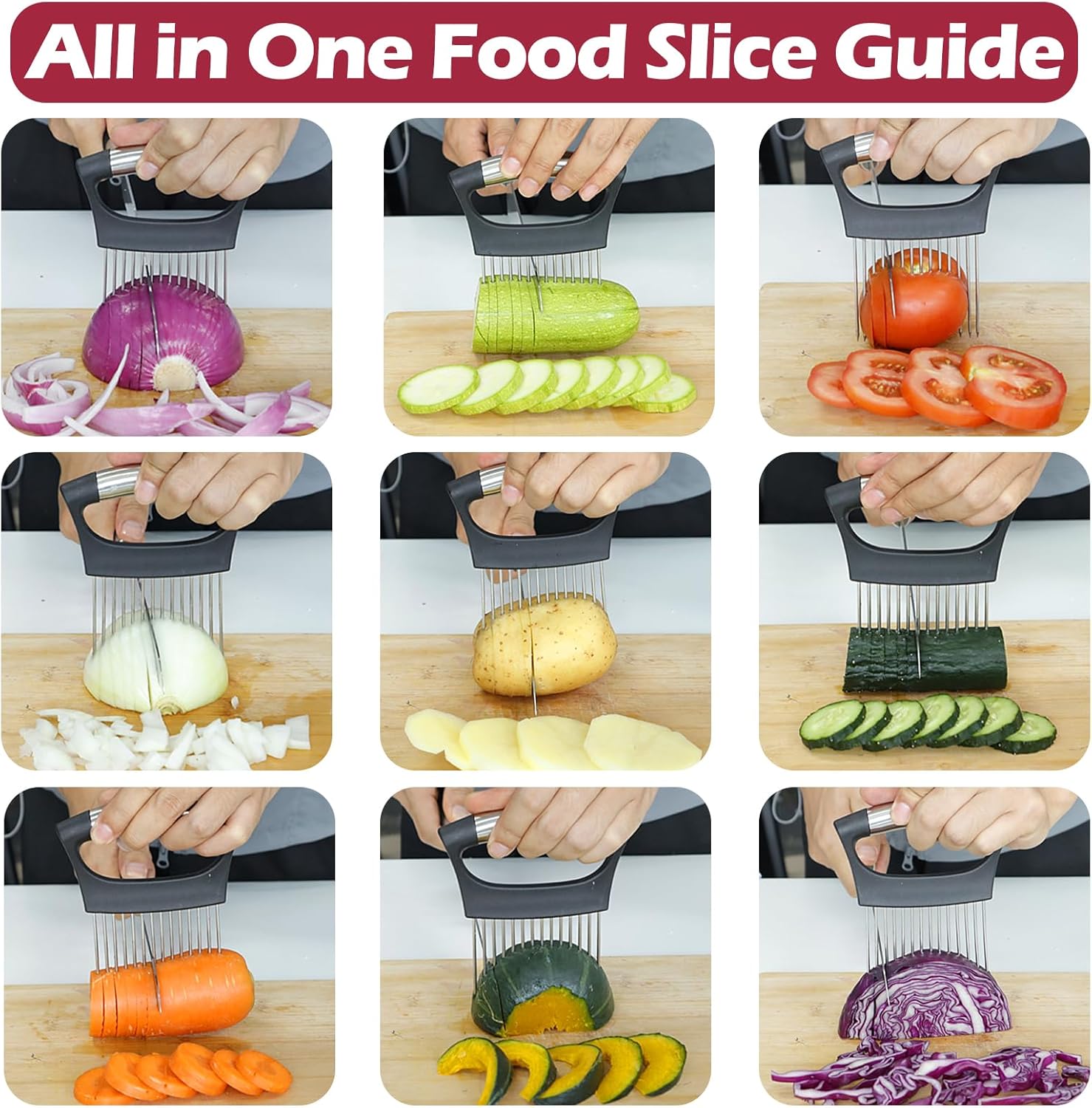 - Multifunctional Kitchen Tool: This Extra-Large onion slicer inserts onions firmly and guides you to evenly slice them into thin slices. You can also use it to slice tomatoes, potatoes or other foods like beef and ham in place to prevent slipping. This onion and vegetable holder for slicing can also be used as a meat tenderiser, with its long steel pins that go deep into the meat, allowing seasonings to get inside fully and add flavour to the meat