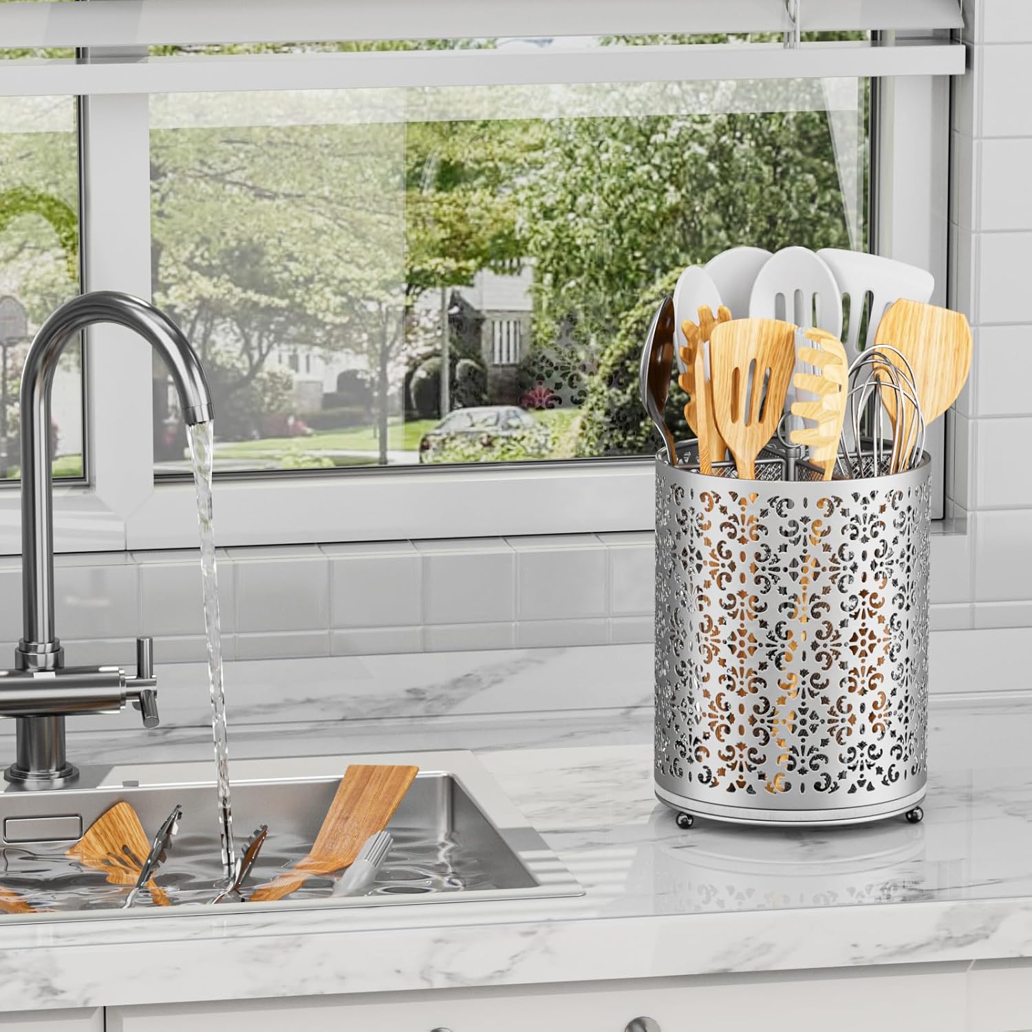 - Stable Flower-Shaped Sections: With 4 compartments, this utensil crock holds 20+ tools upright, ensuring no tipping or sliding of spoons or spatulas. Extra-tall slots fit long or large utensils. The unique flower design provides good breathability, prevents water pooling, and complements any kitchen style.