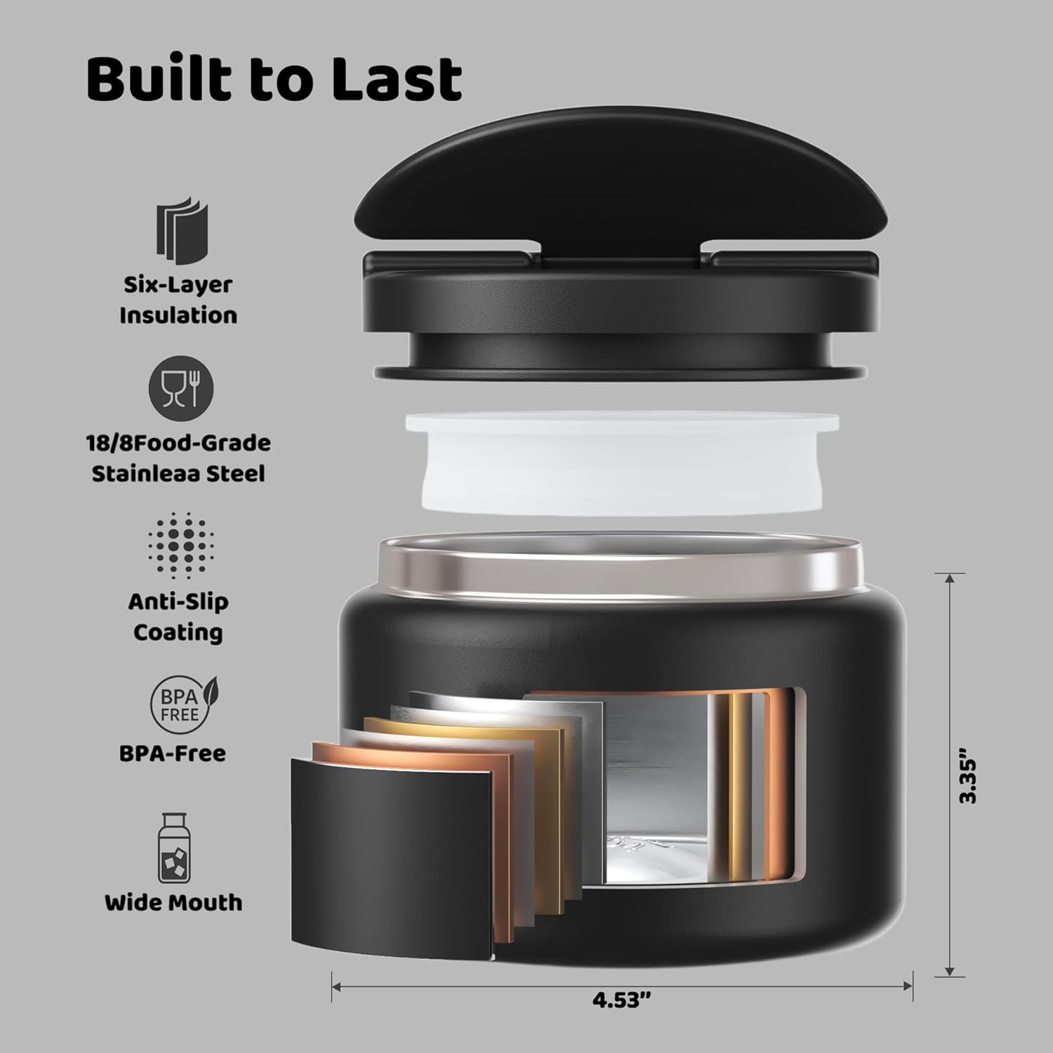- [ Vacuum Insulated ]: The whole thermo made of 18/8 Stainless Steel with vacuum insulation. Keep your food hot/cold for 6-12 hours. Enjoy your warm meal on the go!