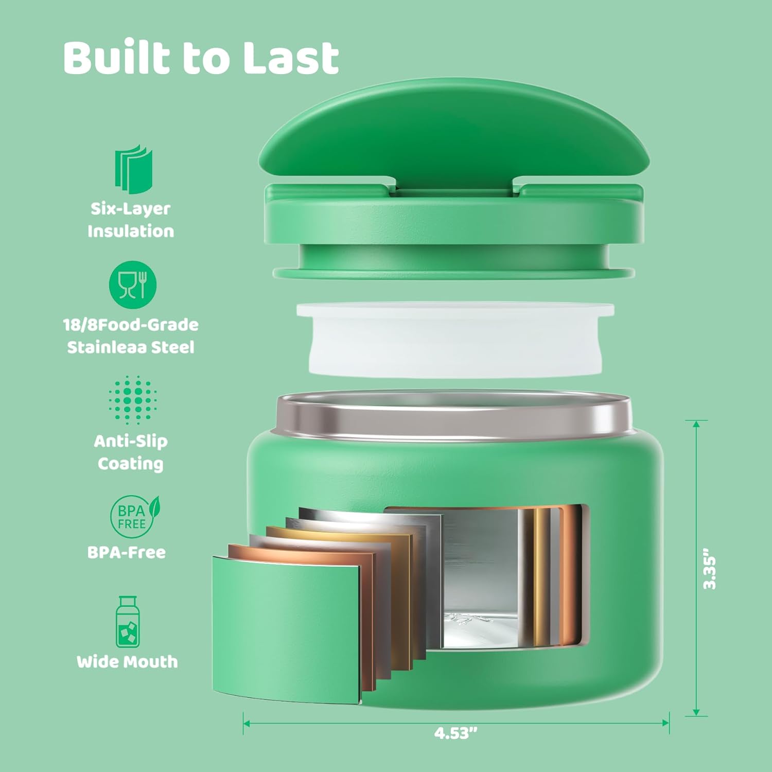 14.5oz Soup Thermo for Hot Food Kids Vacuum Insulated Food Jar Twist-Free Soup Thermo for Hot Food Kids Leakproof Stainless Steel Wide Mouth Lunch Container (Green)