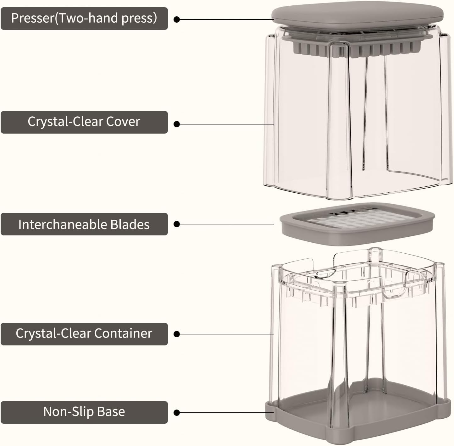 - 【Easy To Use & Clean】Solucky onion slicer is very easy to use. Just put the vegetables into the food container, put the cover on, and then press the top handle down to slice the vegetables. Solucky onion chopper is very easy to clean, and the disassembled parts can be washed in a dishwasher. 1️⃣Place the blade and presser(clockwise). 2️⃣Place the fruit vertically onto the blade. 3️⃣Press down the presser with both hands. 4️⃣Get uniform & fresh-cut French fries. Make your meal preparation much more enjoyable & efficient.