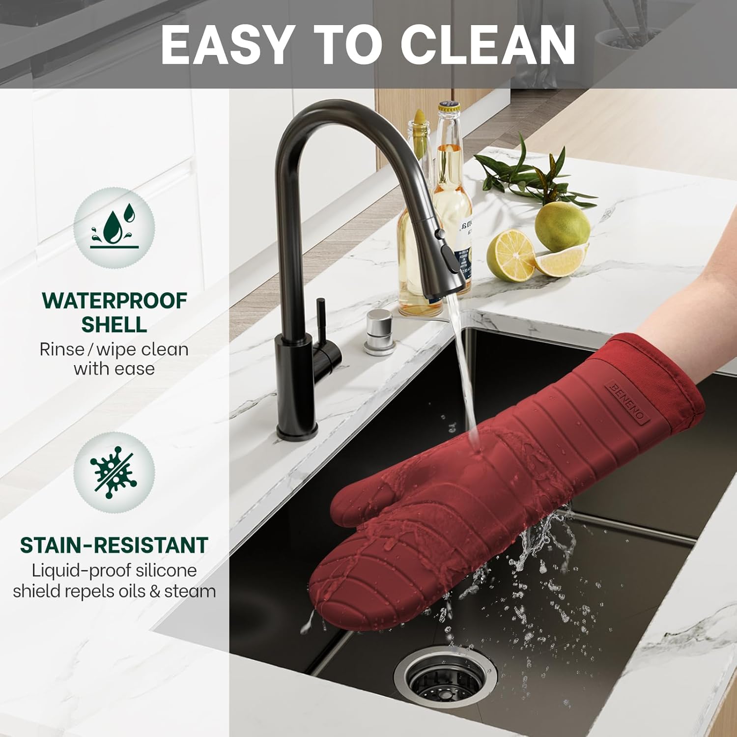 Beneno BPA-Free Silicone Oven Mitts, Heat Resistant Waterproof Oven Mitts with Non-Slip Textured Grip, Comfortable Quilted Lining, Kitchen Pot Holders for Cooking, Baking, Grilling, 7"x13", 2Pcs Red