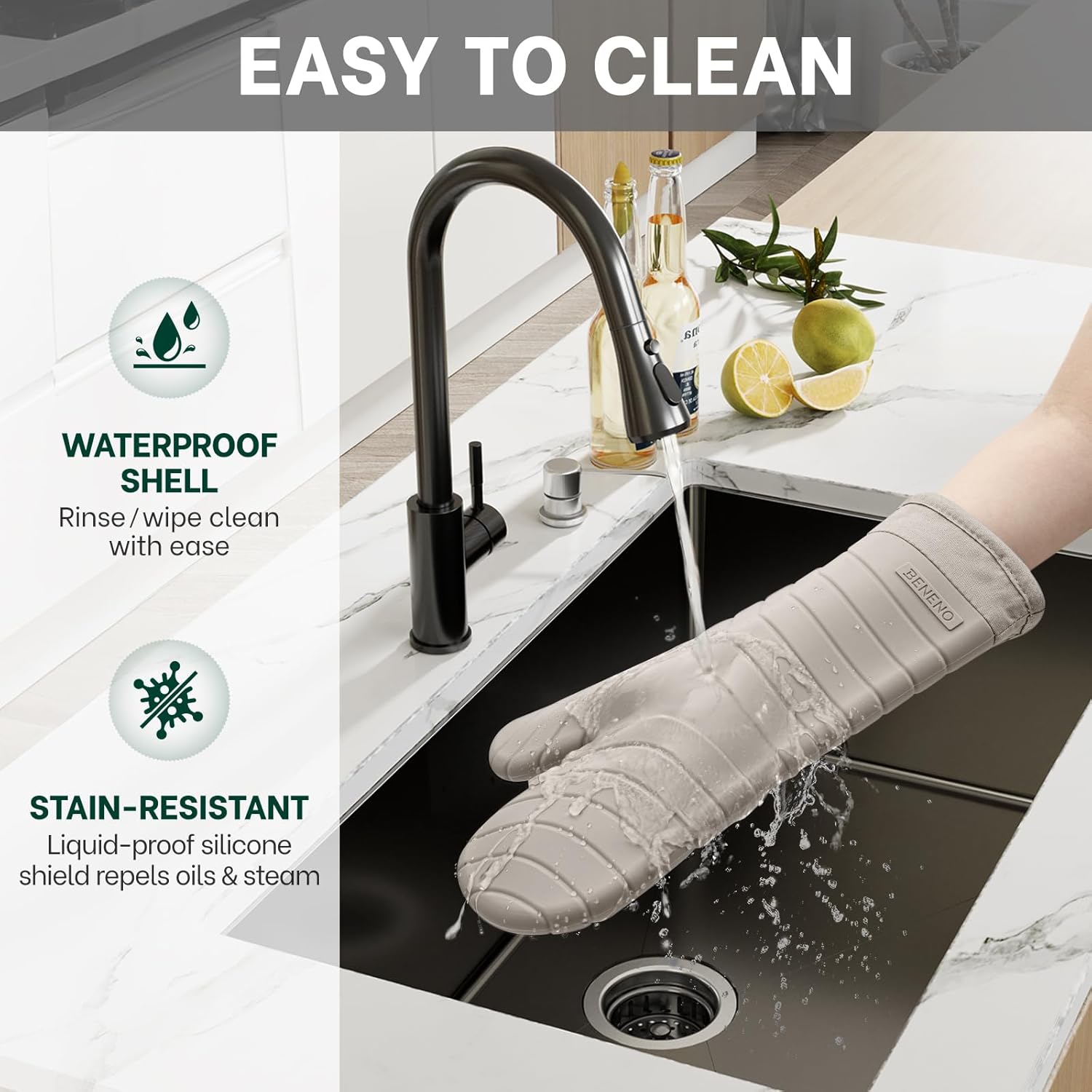 Beneno BPA-Free Silicone Oven Mitts, Heat Resistant Waterproof Oven Mitts with Non-Slip Textured Grip, Comfortable Quilted Lining, Kitchen Pot Holders for Cooking, Baking, Grilling, 7"x13", 2Pcs Beige