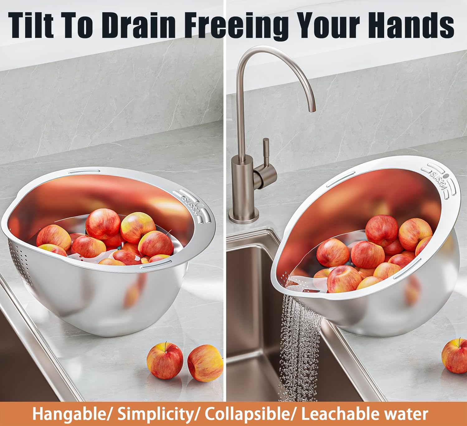 - Easy to Clean: This stainless-steel colander features a smooth, non-porous surface for effortless cleaning: simply rinse over your sink strainer or pop into the dishwasher. Both the main strainer body and the grater lid feature dedicated hanging holes, allowing convenient hang-for-storage to save valuable space.