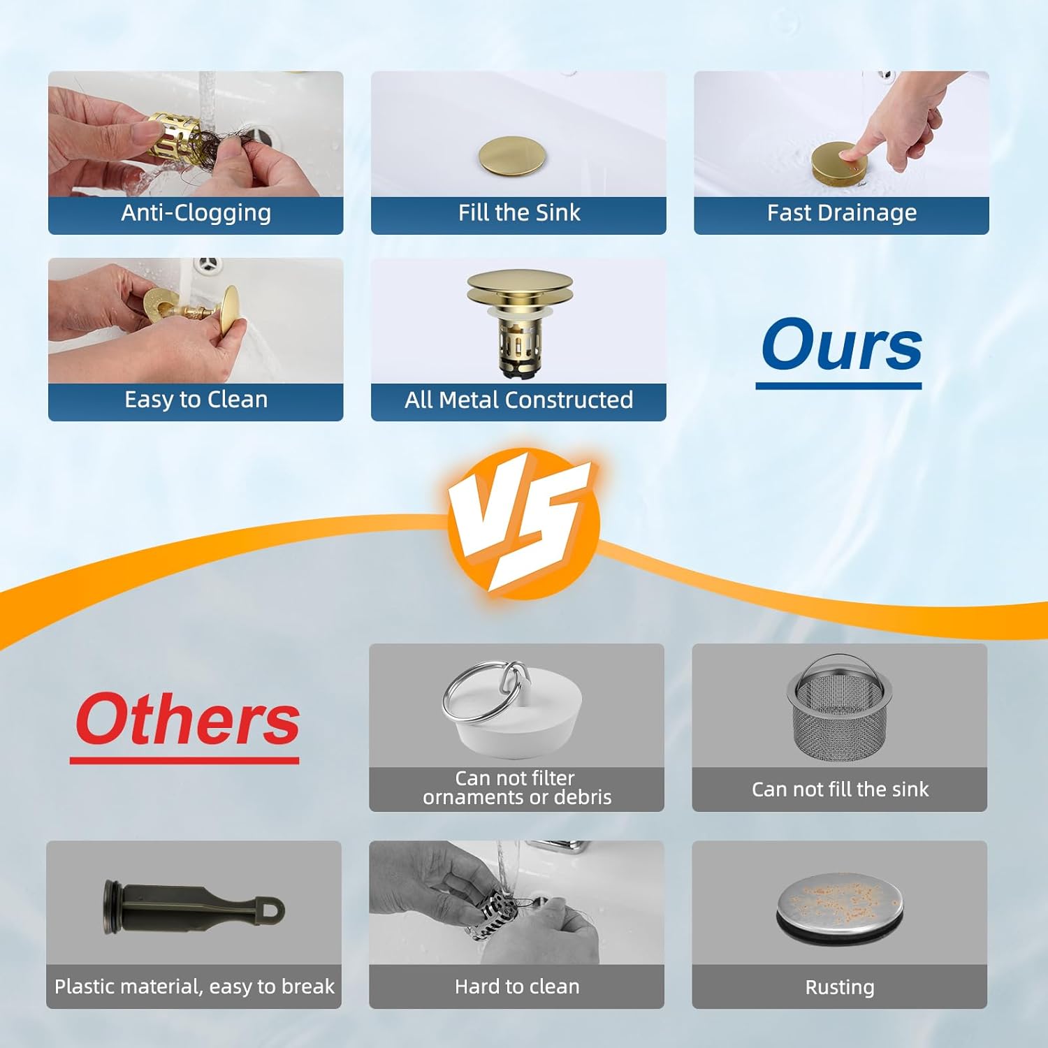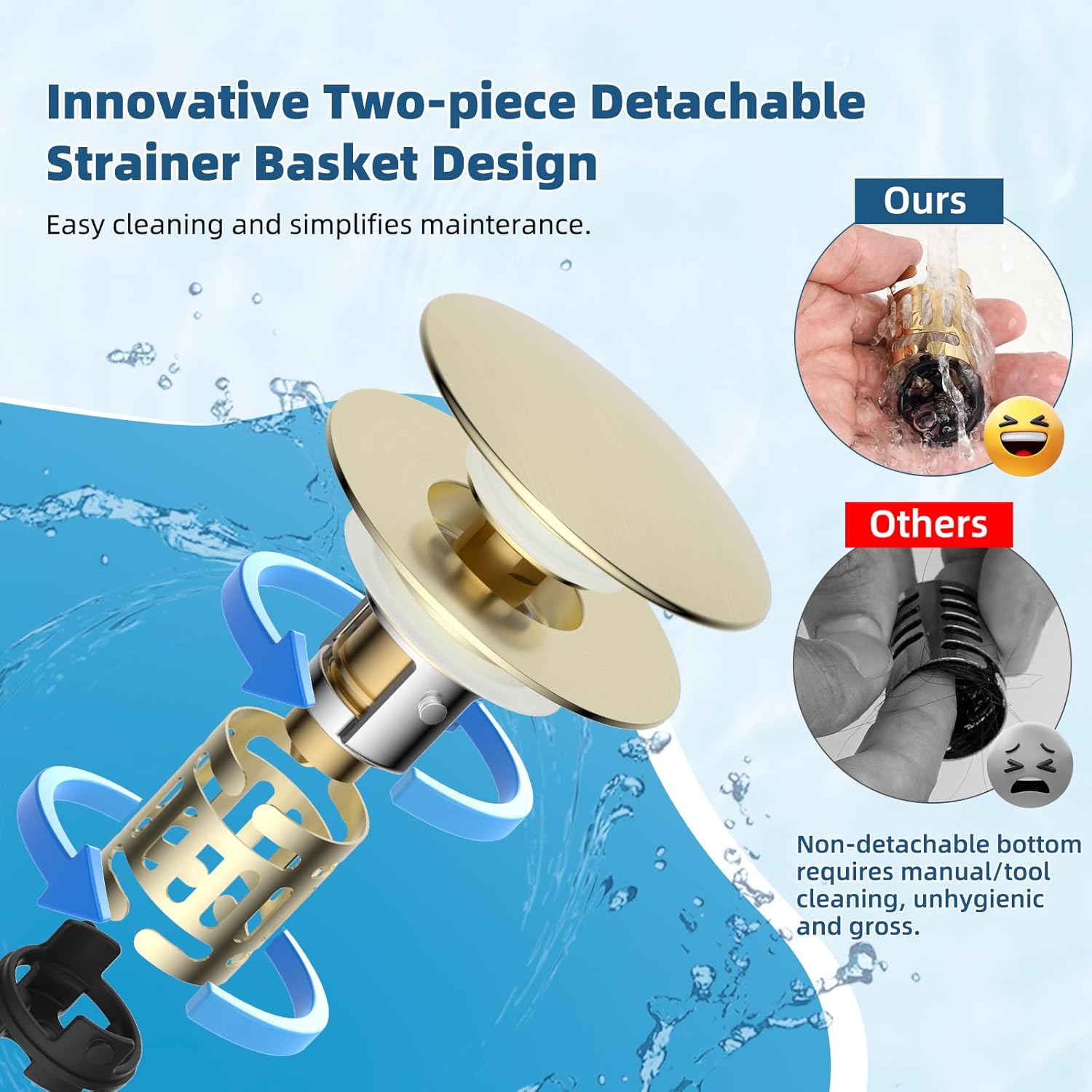 - [Pop-up Design with Big Push Cap] Our sink drain strainer is made of high-quality stainless steel, solid brass, and plastic, providing exceptional rebound strength, corrosion resistance, and long-lasting durability. It features a sensitive pop-up solid brass bullet core, allowing you to easily switch between the water storage and fast drainage with just a gentle press. The large metal push cap has an innovative design that allows both finger and palm pressing for a more comfortable experience