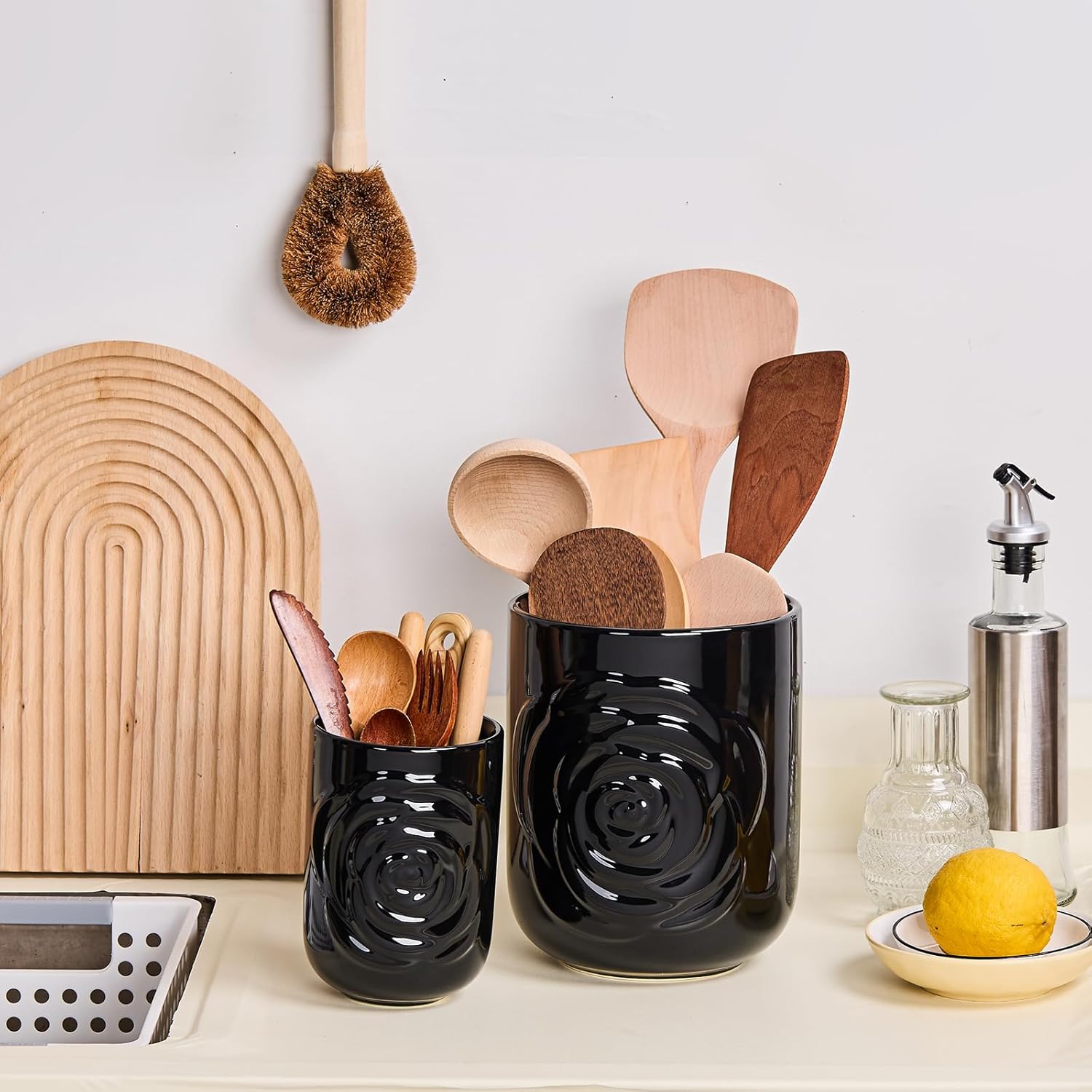 Black Ceramic Utensil Holder Set of 2 - Rose Carved Design, Kitchen Countertop Utensil Organizer for Spatula, Spoon & Cooking Tools, Large (7.5") & Small (5.5"), Farmhouse Kitchen Counter Decor