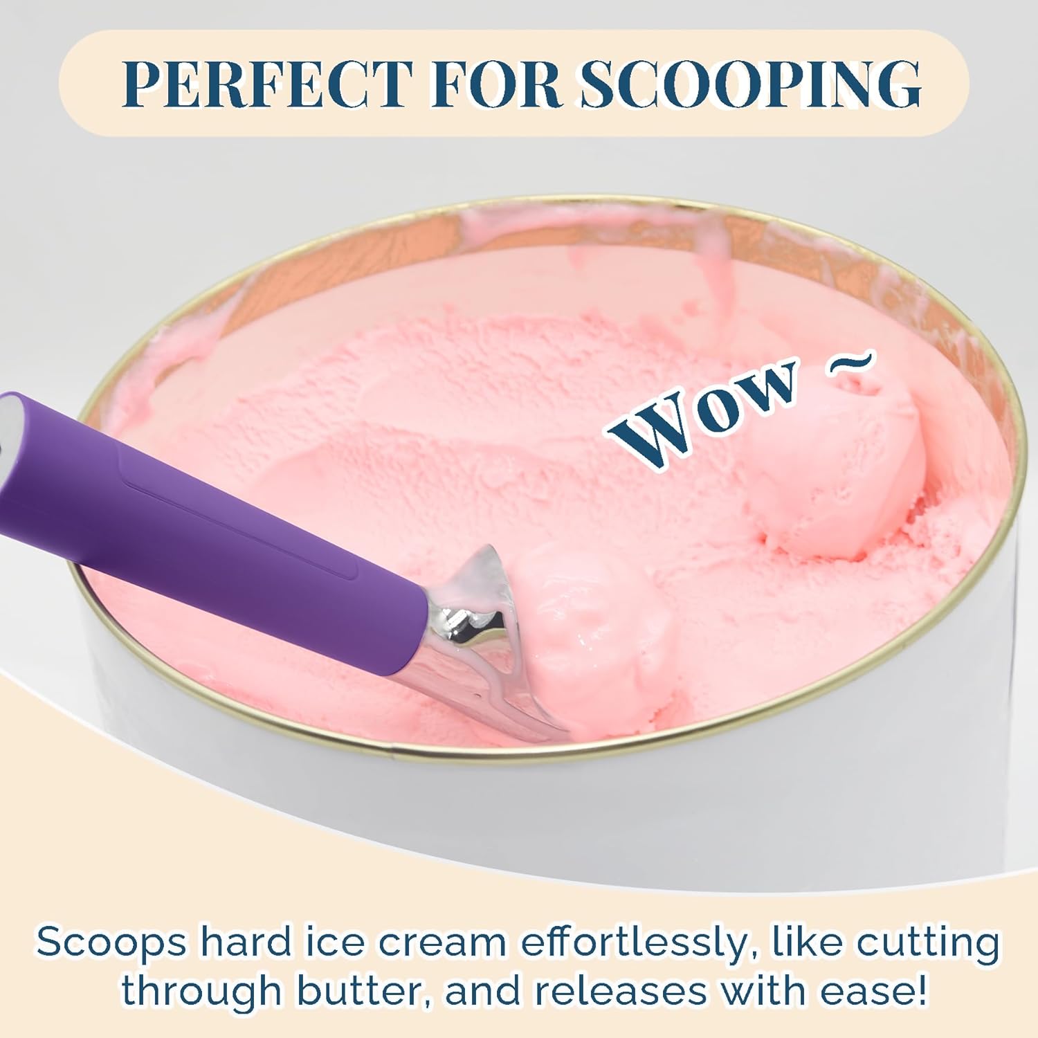 - [Effortless Hard Ice Cream Scooping] – No more bending spoons or waiting for ice cream to thaw. This heated ice cream scoop warms up quickly to 70°C, letting you glide through even rock-solid ice cream straight from the freezer. Just grip the handle to activate heating — no buttons required. It continues warming for 40 seconds after use, making every scoop smooth and simple. Perfect for ice cream, gelato, or frozen yogurt