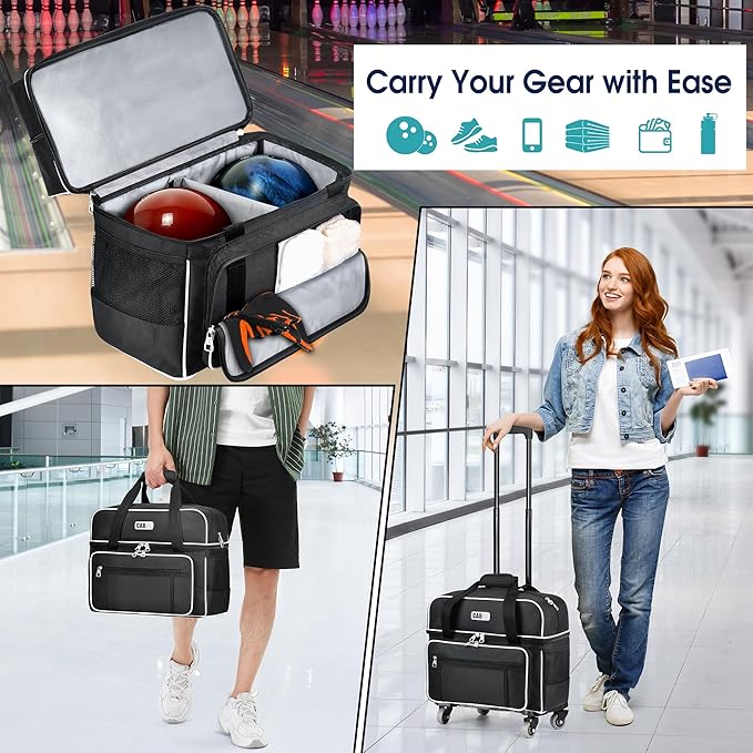 • ★ MULTIFUNCTION POCKETS : Multifunction pockets are in the front of 4-wheels 2 ball bowling bag for your phones, keys, towels.Two Side Pockets: Twins large mesh pockets are the sides of the bowling bag not only for storing your bottles. In addition, there is a separate waterproof shoe compartment at the top of the bag, which can store a pair of bowling shoes up to men size 16.