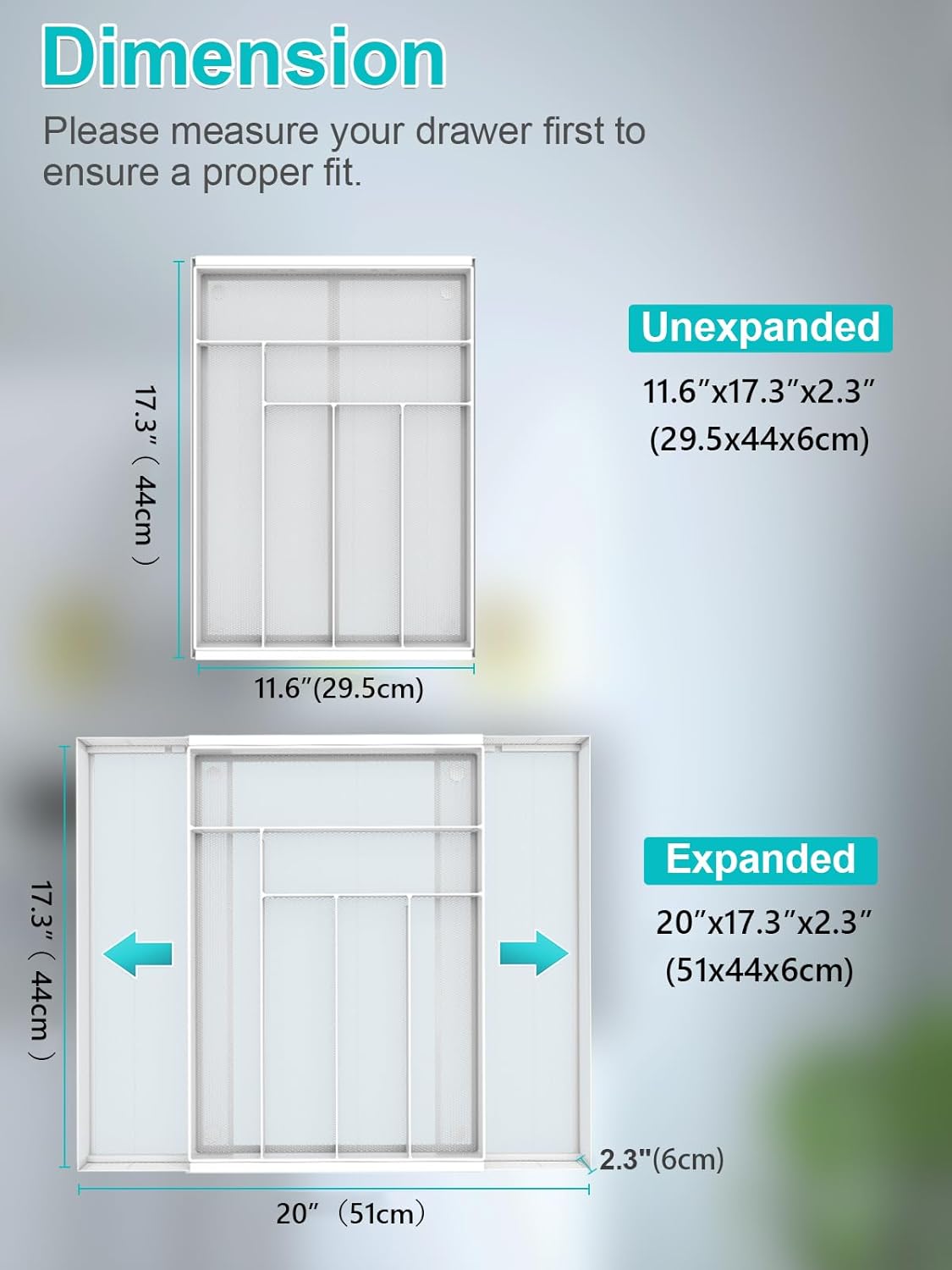 - Stay Organized:This Metal Silverware Organizer Features 7 Deep Compartments That Allow You to See Everything at a Glance—No More Clutter! The Space-Saving Design Helps You Find What You Need Quickly, Whether It's Your Favorite Knife or Spoon. Measure Your Drawer First! Minimum Drawer Size Need 11.7"*17.4”.