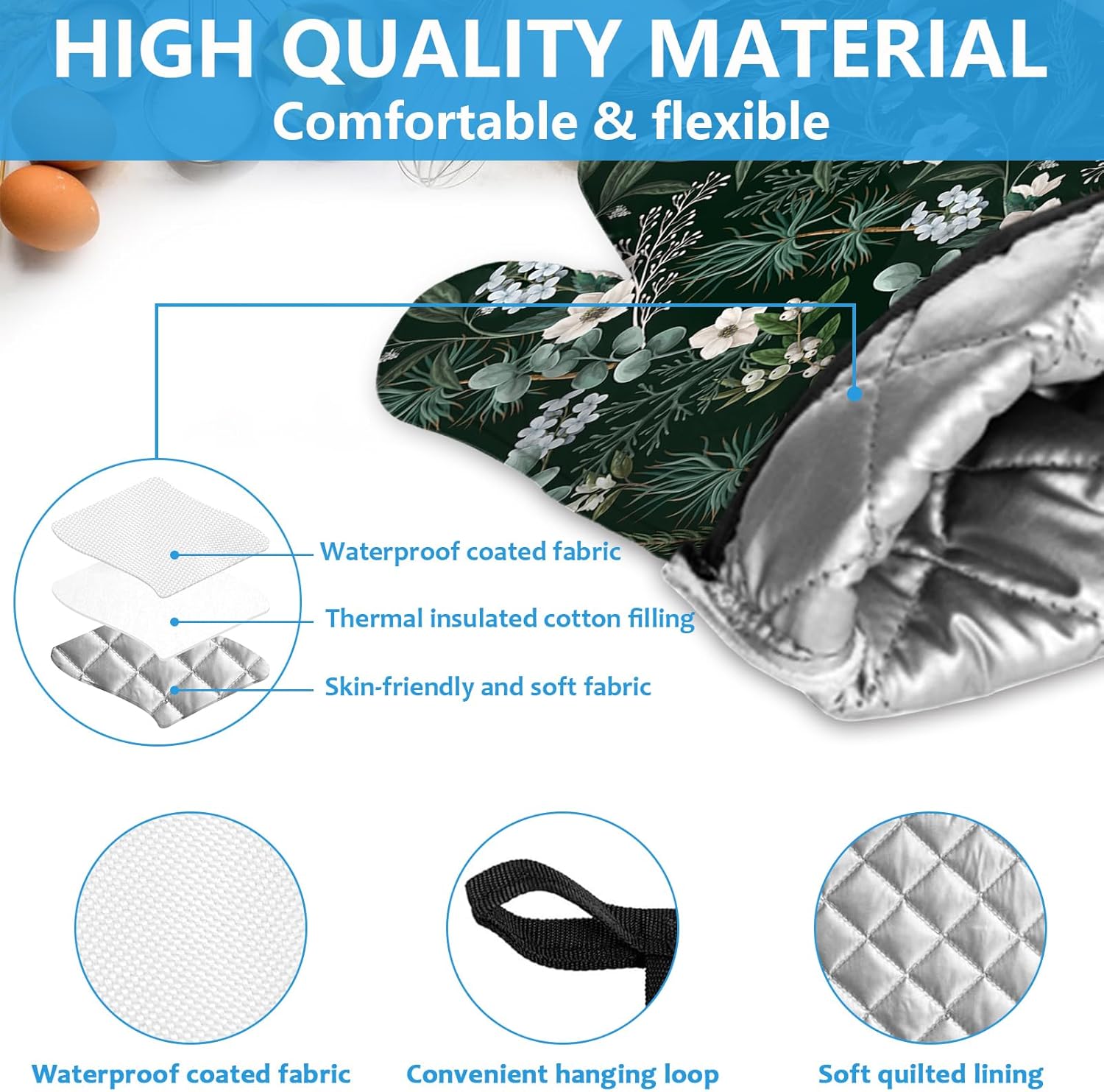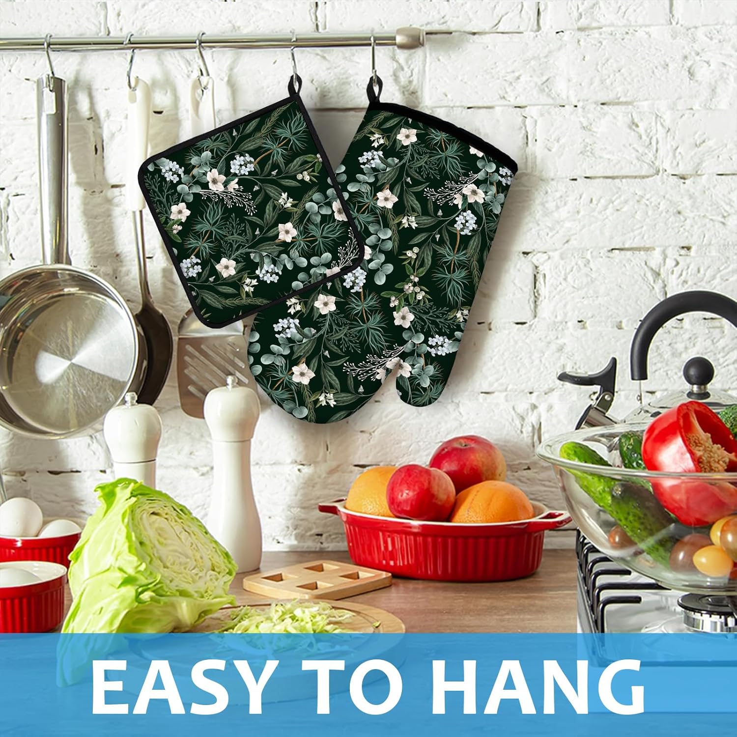 - 【NON-SLIP DESIGN】Kitchen insulating mats and oven mitts have a special non-slip texture on the surface and a soft, comfortable lining that provides a secure, non-slip grip when handling pots and pans, effectively preventing items from slipping off. The oven mitt is designed with a hanging loop for easy hanging.