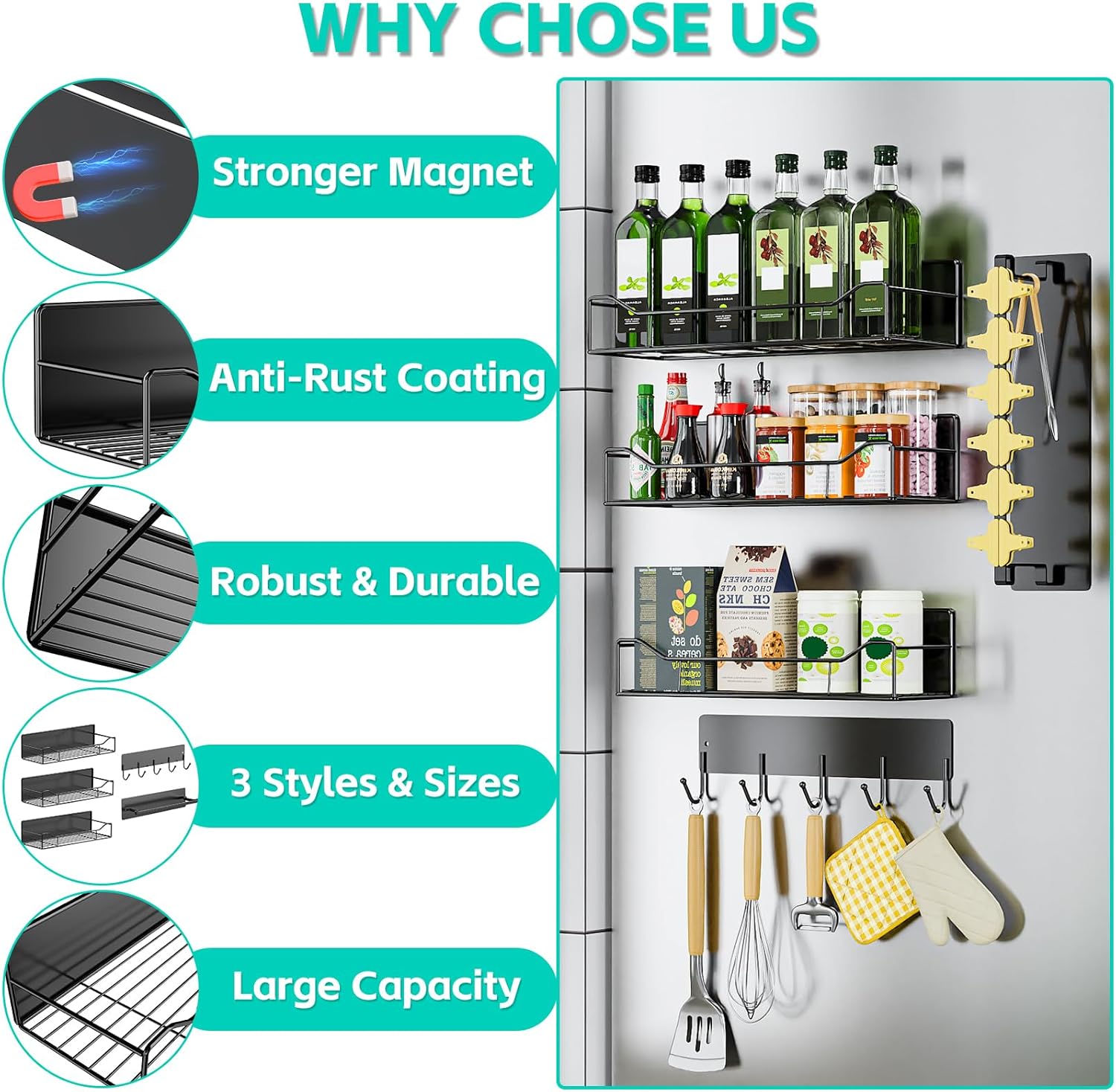 - ✅【Multifunctional Storage Combination】Our 5-piece magnetic rack makes organization flexible and efficient! It includes large, medium and small metal racks, as well as metal hooks and metal towel racks, which can meet the storage needs of washing machines and refrigerators in multiple scenarios, say goodbye to laundry/kitchen clutter, and easily improve the utilization rate of home storage space.
