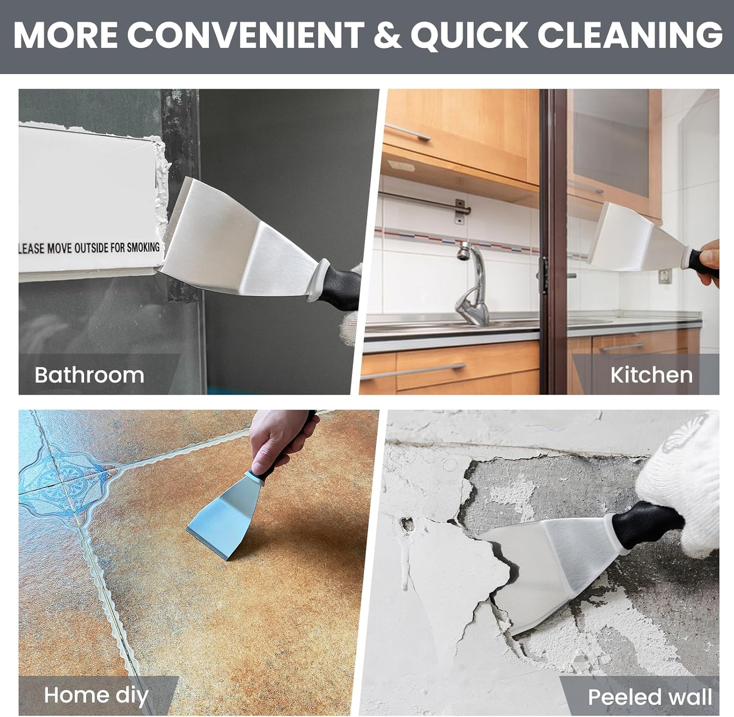 - Curved Floor Scraper Design: Bent blade contours to tight corners and flat surfaces, protecting hands while scraping. Perfect for cleaning floors, peeling stubborn materials, or repairing delicate areas